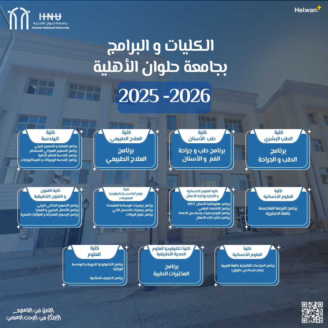 تواصل جامعة حلوان الأهلية تقديم نموذج تعليم عصري متكامل من خلال طرح 22 برنامجًا أكاديميًا متخصصًا داخل 9 كليات متنوعة، تغطي قطاعات الطب، الهندسة، التكنولوجيا، الفنون، والعلوم الإنسانية، بما يعكس التوجه الوطني نحو تطوير منظومة التعليم العالي في مصر، وتلبية احتياجات سوق العمل المحلي والدولي.