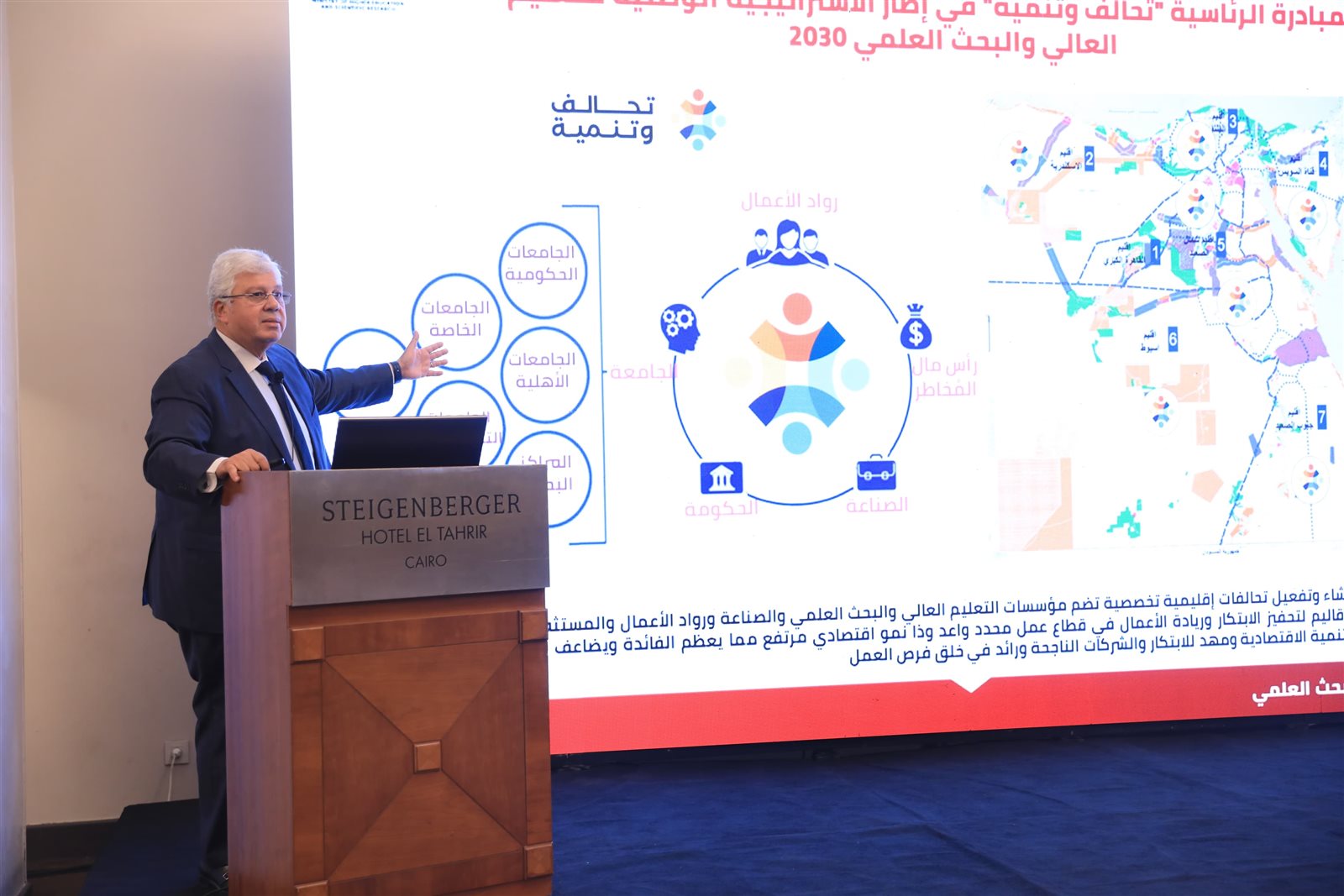 وخلال فعاليات المؤتمر، أكد وزير التعليم العالي والبحث العلمي، أهمية مبادرة "تحالف وتنمية" في دعم التنمية الشاملة بالأقاليم المختلفة، وتعزيز التعاون بين الجامعات، ومجتمع الصناعة، ضمن رؤية مصر 2030، من خلال دمج مفاهيم الجيل الرابع للتعليم العالي والبحث العلمي، وتكامل أدواره في التعليم، والبحث، وخدمة المجتمع، وريادة الأعمال، مشيرًا إلى أن مبادرة "تحالف وتنمية" هى مبادرة رئاسية تحظى بمتابعة القيادة السياسية، موجهًا الشكر للسيد الرئيس عبدالفتاح السيسي على رعايته للمبادرة، وتقديم كافة سبل الدعم لها، حيث خصص للمبادرة مليار جنيه، مؤكدًا أن المبادرة تمثل تحالفات أكاديمية، وعلمية، وصناعية، وبدأ تنفيذها عبر سبعة تحالفات إقليمية عقب إطلاق الاستراتيجية الوطنية للتعليم العالي والبحث العلمي، والتي ترتكز على رؤية مصر 2030، والتحول نحو جامعات الجيل الرابع، وربط التعليم بخطة التنمية الشاملة، كما بدأت المبادرة بتشكيل لجنة من الحكماء تضم مختلف القطاعات إلى جانب الجامعات الحكومية.