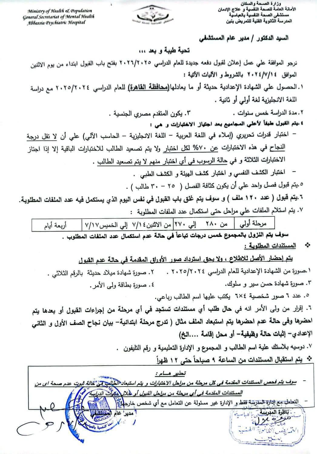 - الحصول على الشهادة الإعدادية حديثة أو ما يعادلها (محافظة القاهرة) للعام الدراسي ٢٠٢٥/٢٠٢٤
