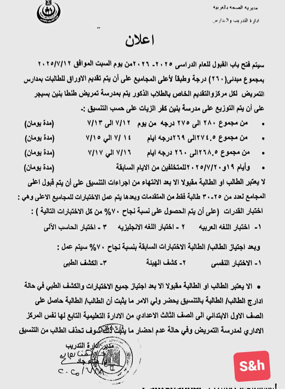 وأضافت أنه قبل إدارج الطالب بالتنسيق يحضر ولي الأمر ما يثبت أن الطالب حاصل على الصف الأول الابتدائي إلى الصف الثالث الإعدادي من الادارة التعليمية التابع لها نفس المركز الاداري لمدرسة التمريض وفي حالة عدم احضار ما يثبت ذلك سوف تحذف الطالب من التنسيق.