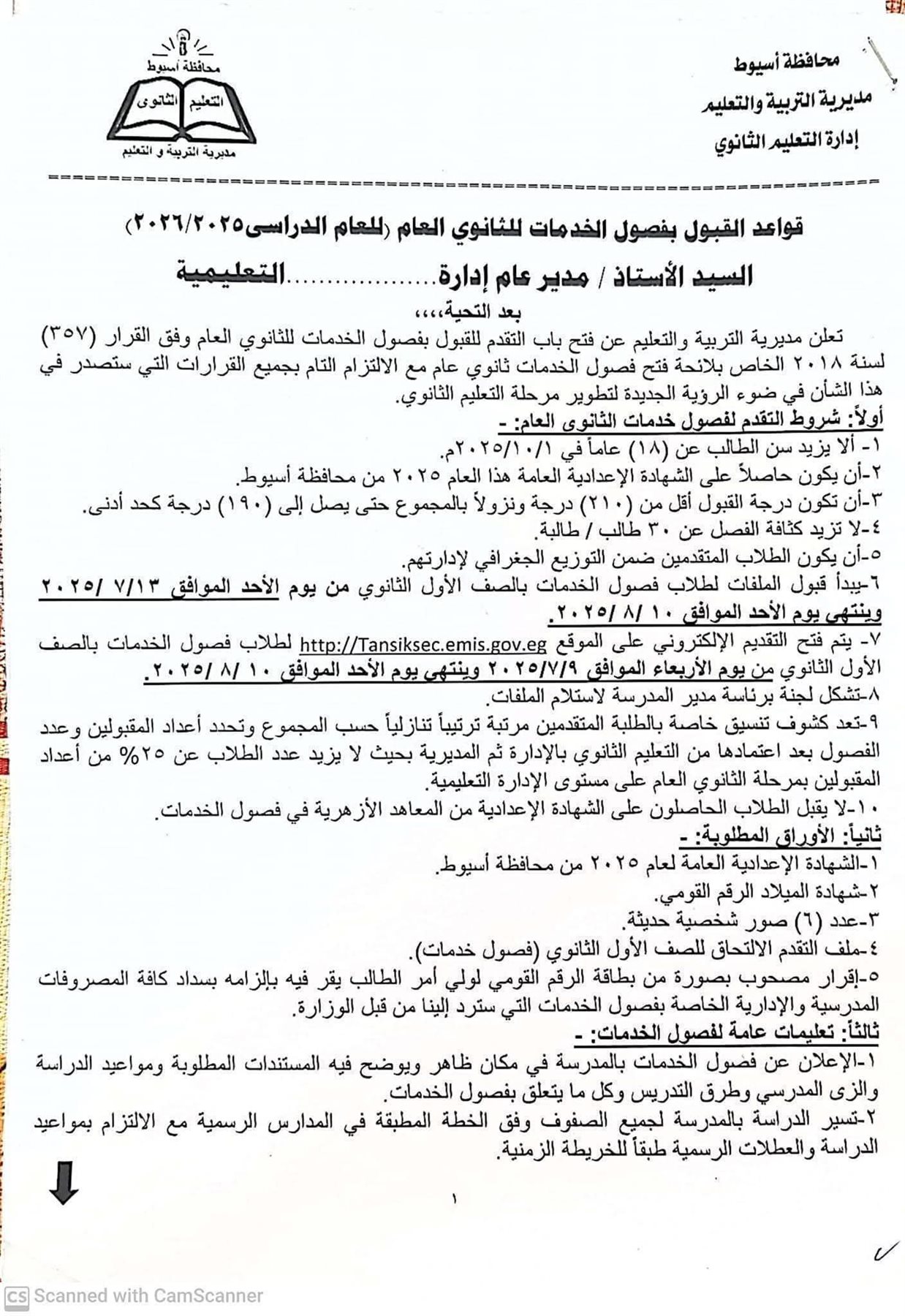 أعلنت مديرية التربية والتعليم بمحافظة أسيوط، عن فتح باب التقدم للقبول بفصول الخدمات لـ الثانوي العام وفق القرار (٣٥٧) لسنة ۲۰۱٨ الخاص بلائحة فتح فصول الخدمات ثانوي عام مع الالتزام التام بجميع القرارات التي ستصدر في هذا الشأن في ضوء الرؤية الجديدة لتطوير مرحلة التعليم الثانوي.