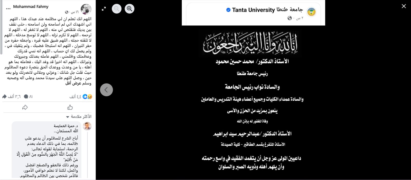 صيدلي بجامعة طنطا يدعي علي أستاذه المتوفي بسبب الظلم.. ما القصة ؟