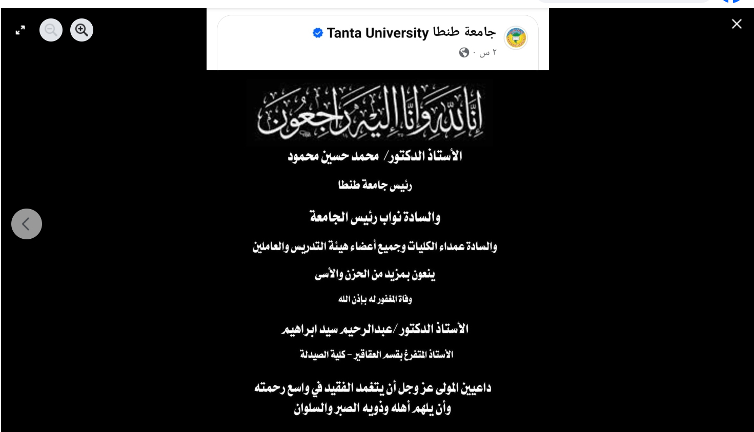 وذلك بعدما نعت جامعة طنطا، في بيان رسمي، الدكتور عبد الرحيم سيد إبراهيم، الأستاذ المتفرغ بقسم العقاقير بكلية الصيدلة، مشيدة بمسيرته الأكاديمية، ودوره في خدمة الطلاب والبحث العلمي.