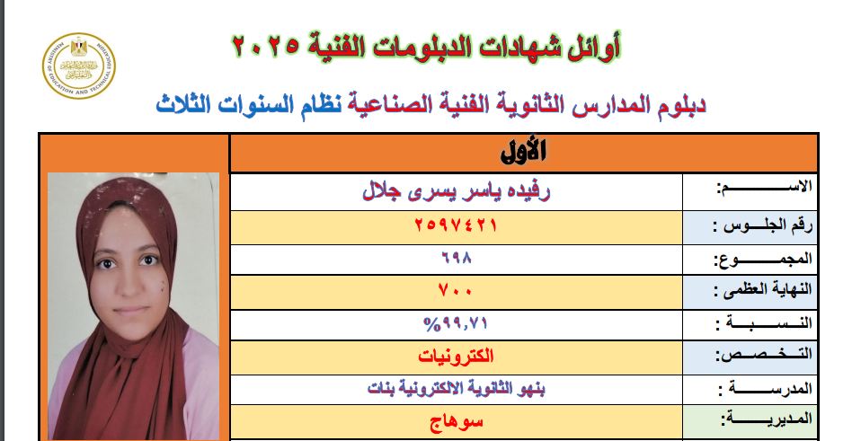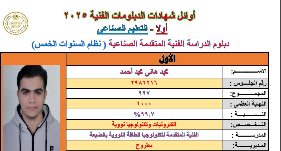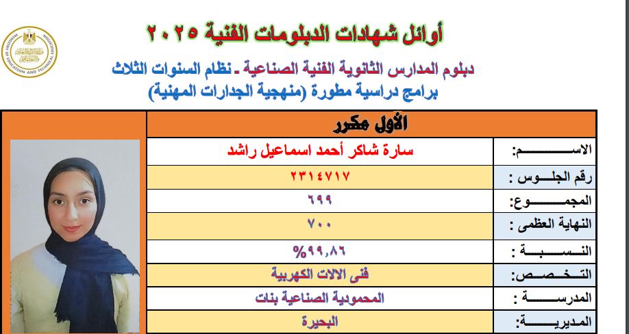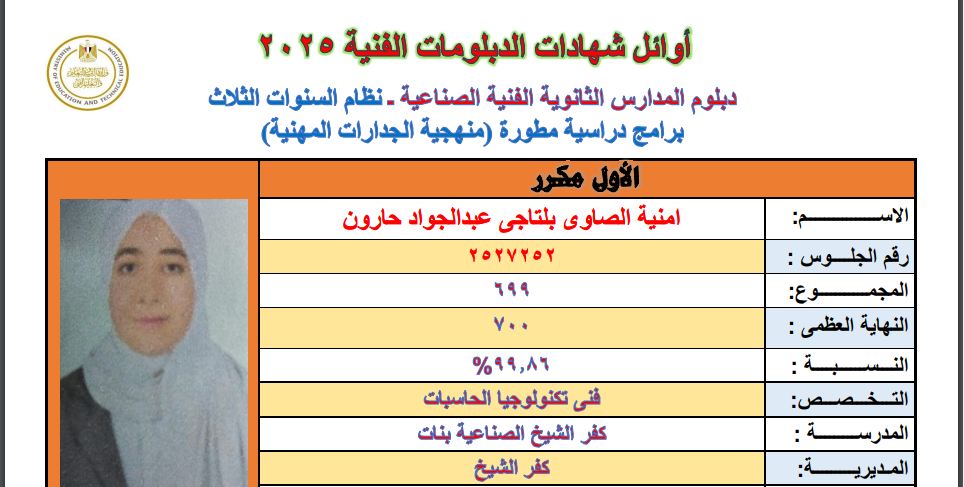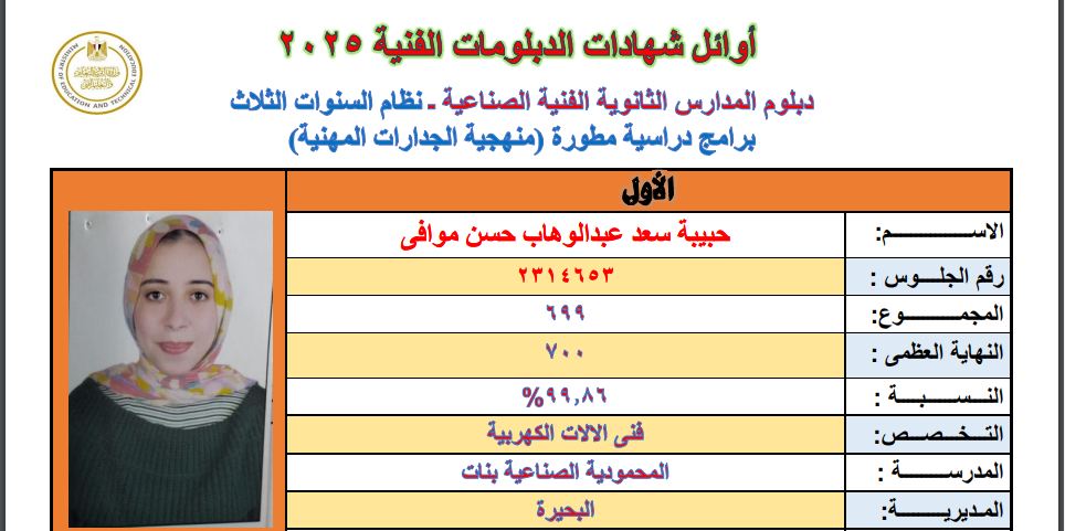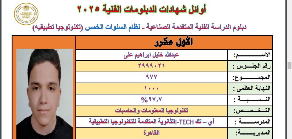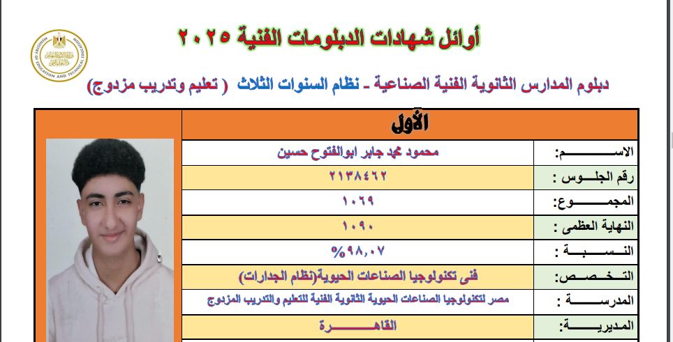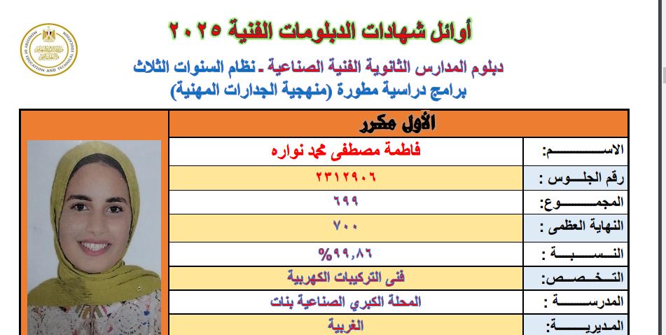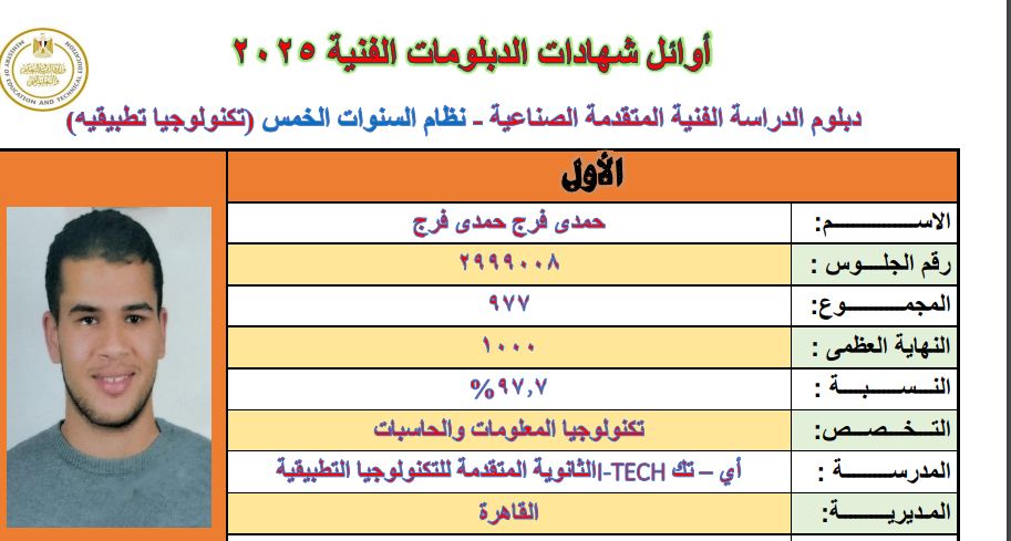 ننشر قائمة أوائل الدبلومات الفنية 2025 الدور الأول.. ورابط النتيجة