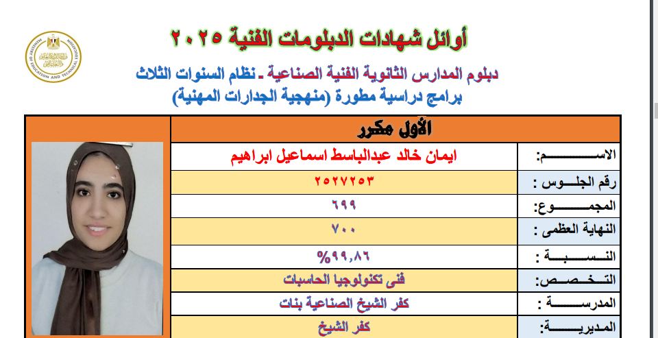 وتضمنت قائمة أوائل الدبلومات الفنية الآتي: