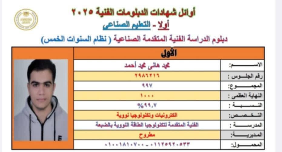 بنسبة 99.7%.. طالب بمدرسة الضبعة النووية يحصد المركز الأول على الجمهورية بالدبلومات الفنية 2025