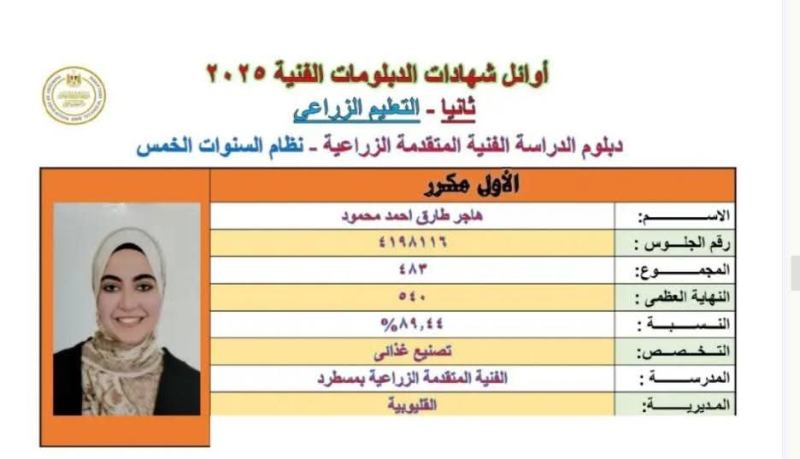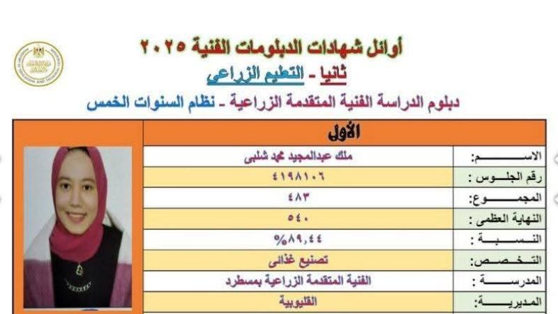 هنأ المحافظ الطالبتين هاجر طارق أحمد محمود وملك عبد المجيد محمد شلبي، وكلتاهما من المدرسة الفنية المتقدمة الزراعية بمسطرد، تخصص تصنيع غذائي، وقد حققت كلتاهما مجموعًا قدره 483 درجة، بنسبة مئوية بلغت 89.44%، ليشاركا سويًا في قائمة أوائل الجمهورية.