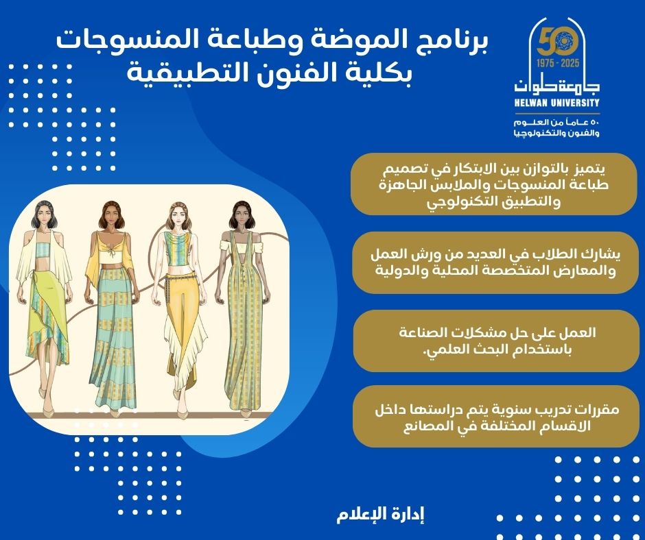يعد برنامج الموضة وطباعة المنسوجات بكلية الفنون التطبيقية جامعة حلوان أول برنامج بيني يجمع بين قسمي الملابس الجاهزة والطباعة والصباغة والتجهيز، وتكون الدراسة باللغة الإنجليزية.