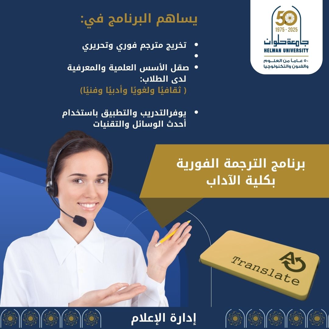 ويمثل برنامج الترجمة الفورية بكلية الآداب جامعة حلوان خيارًا مثاليًا للطلاب الراغبين في دراسة الترجمة بشكل أكاديمي متعمق، والانخراط في مجالات مهنية متعددة مثل الإعلام، الترجمة الفورية للمؤتمرات، المؤسسات الدولية، والسياحة، ويعد من أبرز البرامج النوعية التي تقدمها جامعة حلوان في إطار سعيها للتميز الأكاديمي وربط المخرجات التعليمية بسوق العمل.