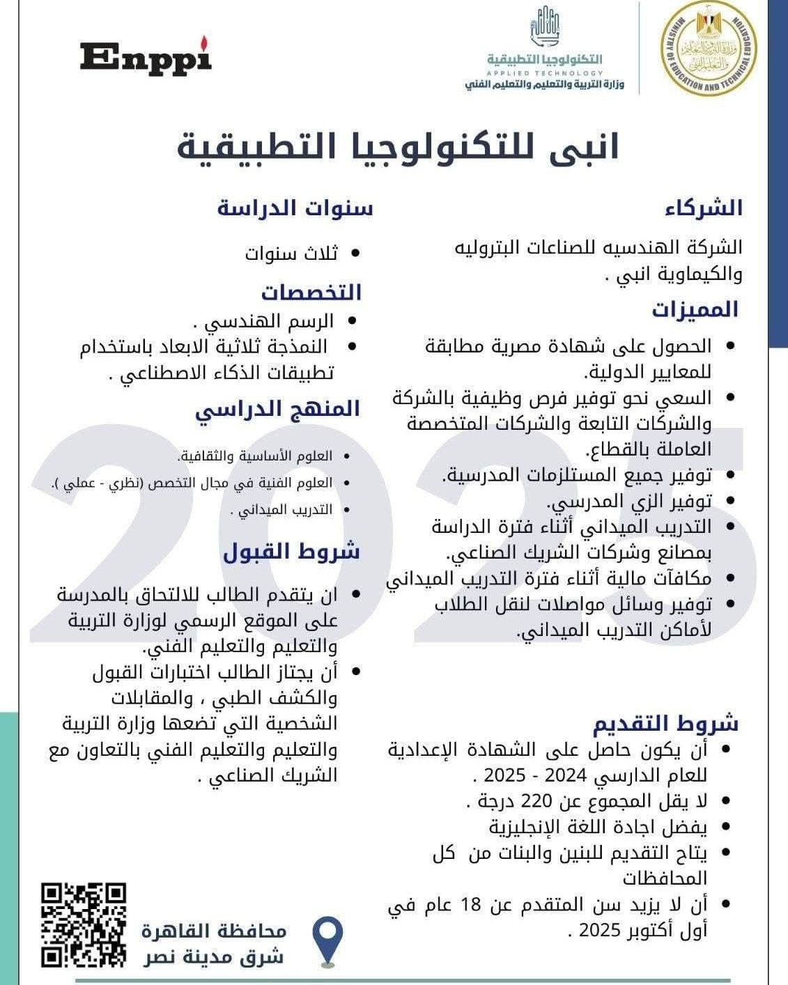 في إطار استراتيجية قطاع البترول للمسئولية المجتمعية، وحرصًا من وزارة البترول والثروة المعدنية على دعم التعليم الفني ورفع جودته بالتعاون مع مختلف مؤسسات الدولة، أعلنت وزارة التربية والتعليم والتعليم الفني عن فتح باب التقديم للالتحاق بمدرسة إنــبي للتكنولوجيا التطبيقية للعام الدراسي 2025/2026.