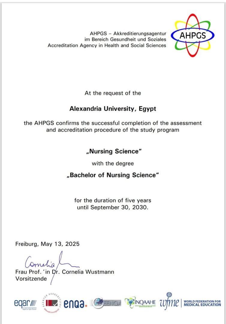 كلية التمريض جامعة الإسكندرية تحصل على الاعتماد الدولي من الهيئة الألمانية AHPGS
