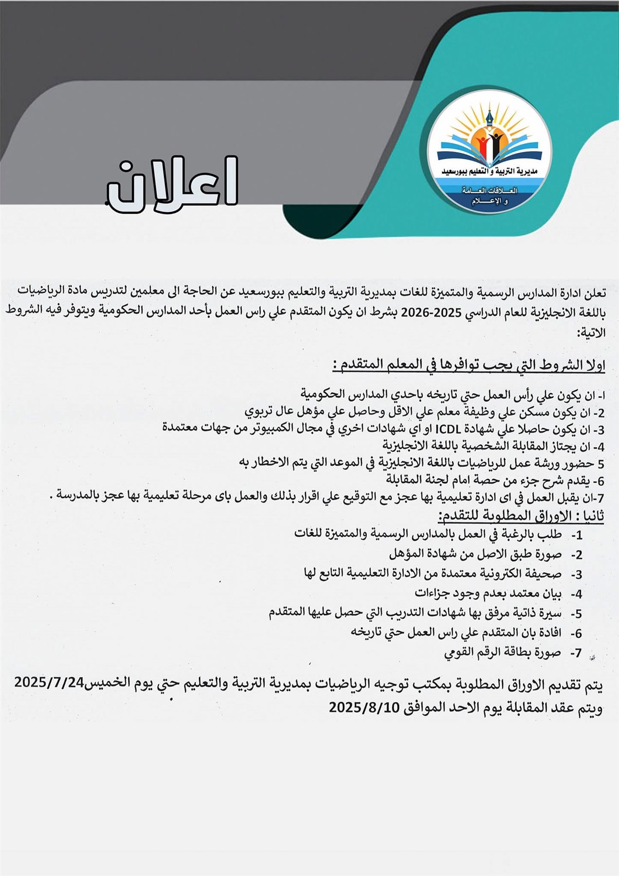 أعلنت إدارة المدارس الرسمية والمتميزة للغات بمديرية التربية والتعليم ببورسعيد عن الحاجة لـ معلمين لتدريس مادة الرياضيات باللغة الإنجليزية للعام الدراسي 2025-2026 بشرط أن يكون المتقدم علي راس العمل بأحد المدارس الحكومية ويتوفر فيه الشروط الآتية: