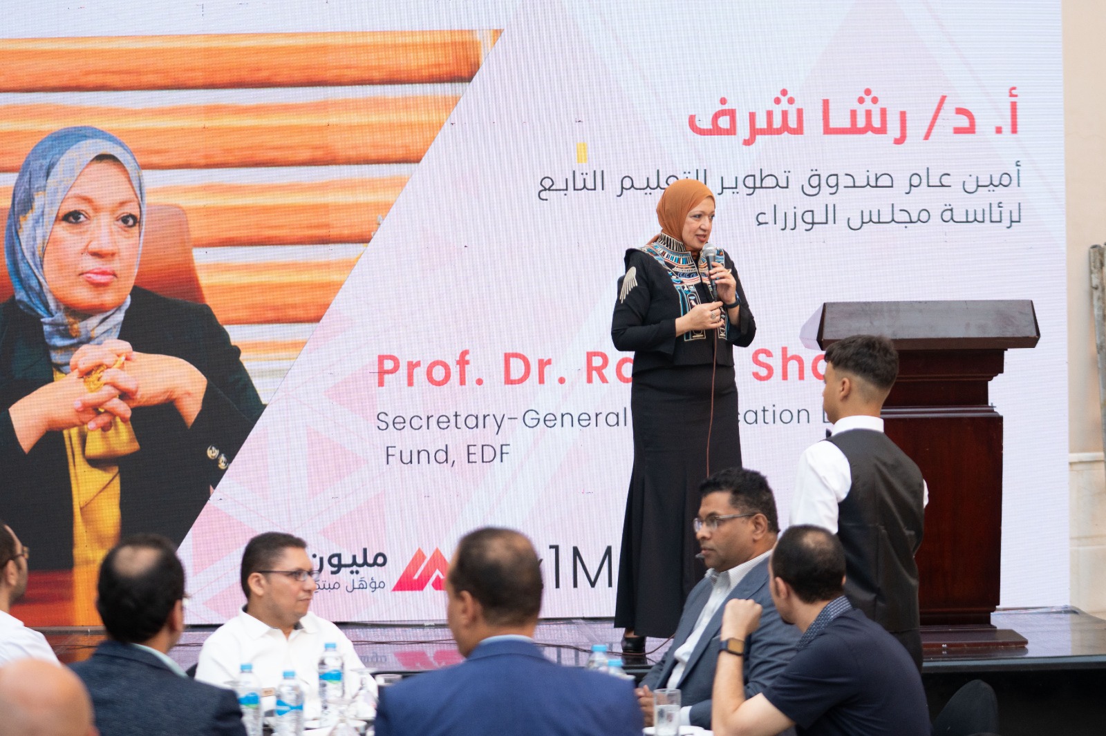 وأكدت الدكتورة رشا شرف أمين عام صندوق تطوير التعليم أن اليوم هو يوم مميز نشهد فيه الانطلاقة الفعلية لمبادرة "كن مستعدًا"، التي حظيت بدعم ورعاية القيادة السياسية، وقد حضرنا جميعًا لنبدأ خطوات التنفيذ الجاد نحو إعداد جيل من الطلاب يمتلك مهارات تقنية وريادية عالمية، يجيد لغات أجنبية، وقادر على خلق فرص عمل لنفسه ولغيره؛ مشيرة إلى حرصها على ارتداء فستان بتصميم فرعوني عبر الذكاء الاصطناعي يحمل اسمها بالهيروغليفية، في رسالة رمزية بأن المستقبل قادم لا محالة، وأن وقت الاستعداد الحقيقي قد حان، وكلنا ثقة في ممثلي مراكز التنمية الوظيفية بالجامعات، ودعم صندوق تطوير التعليم لإنجاح هذه المبادرة وتحقيق حلمنا المشترك.