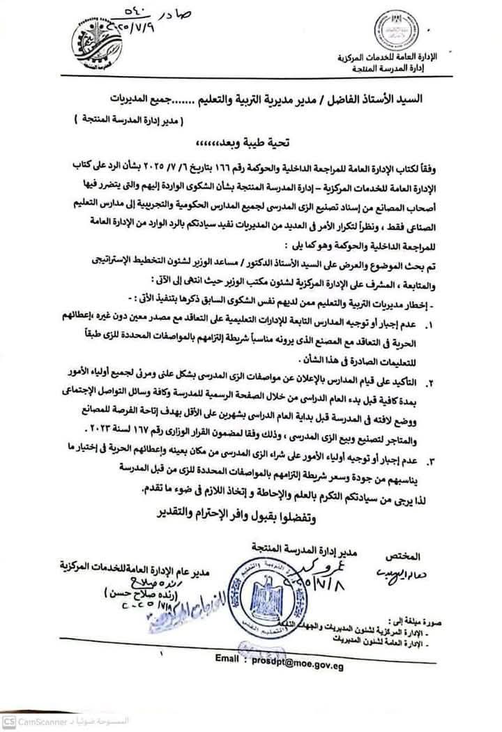 وأشارت إلى أنه وفقًا لكتاب الإدارة العامة للمراجعة الداخلية والحوكمة رقم ١٦٦ بتاريخ ٢٠٢٥/٧/٦ بشأن الرد على كتاب الإدارة العامة للخدمات المركزية - إدارة المدرسة المنتجة بشأن الشكوى الواردة إليهم والتي يتضرر فيها أصحاب المصانع من إسناد تصنيع الزي المدرسي لجميع المدارس الحكومية والتجريبية إلى مدارس التعليم الصناعى فقط، ونظرًا لتكرار الأمر في العديد من المديريات أوضحت الآتي: