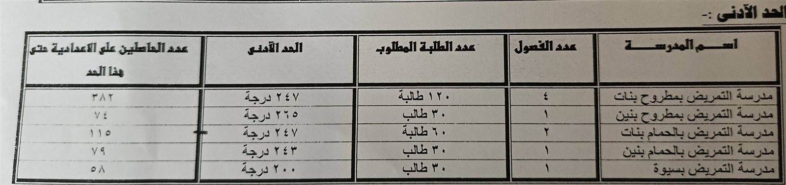اعتمد اللواء خالد شعيب محافظ مطروح، شروط الإلتحاق وبدء التقديم بمدارس التمريض للعام الدراسي الجديد، مع مراعاة مبدأ التوطين وإتاحة الفرصة لأبناء المحافظة.