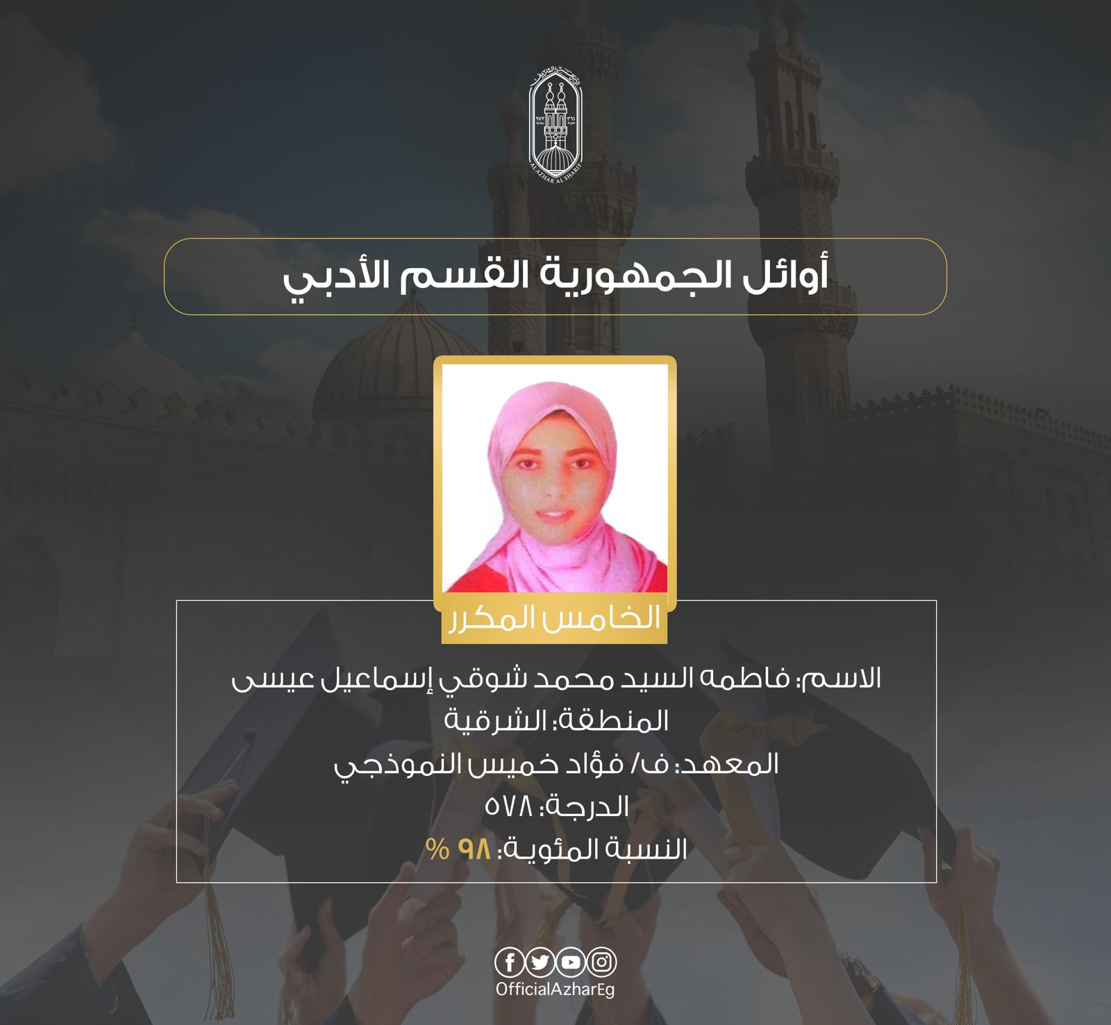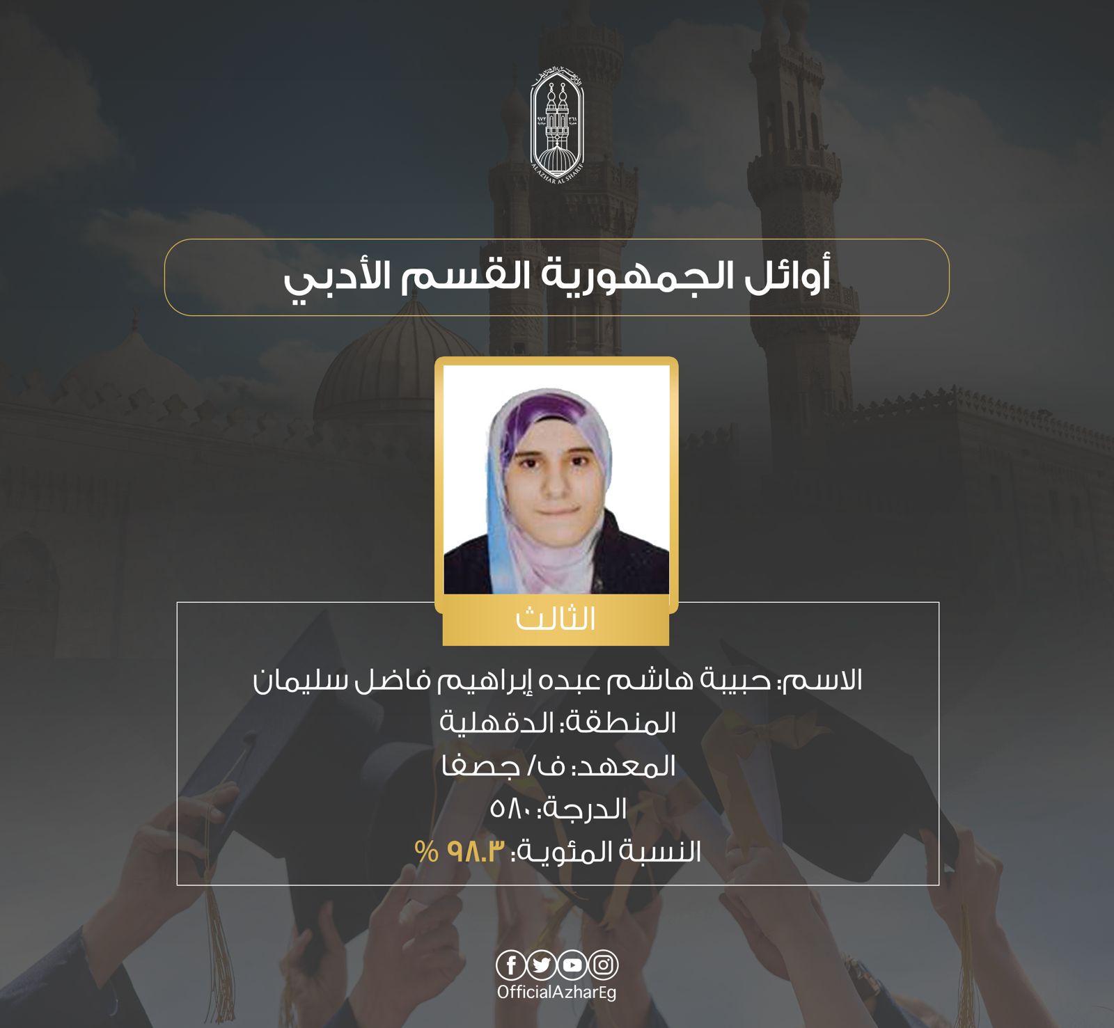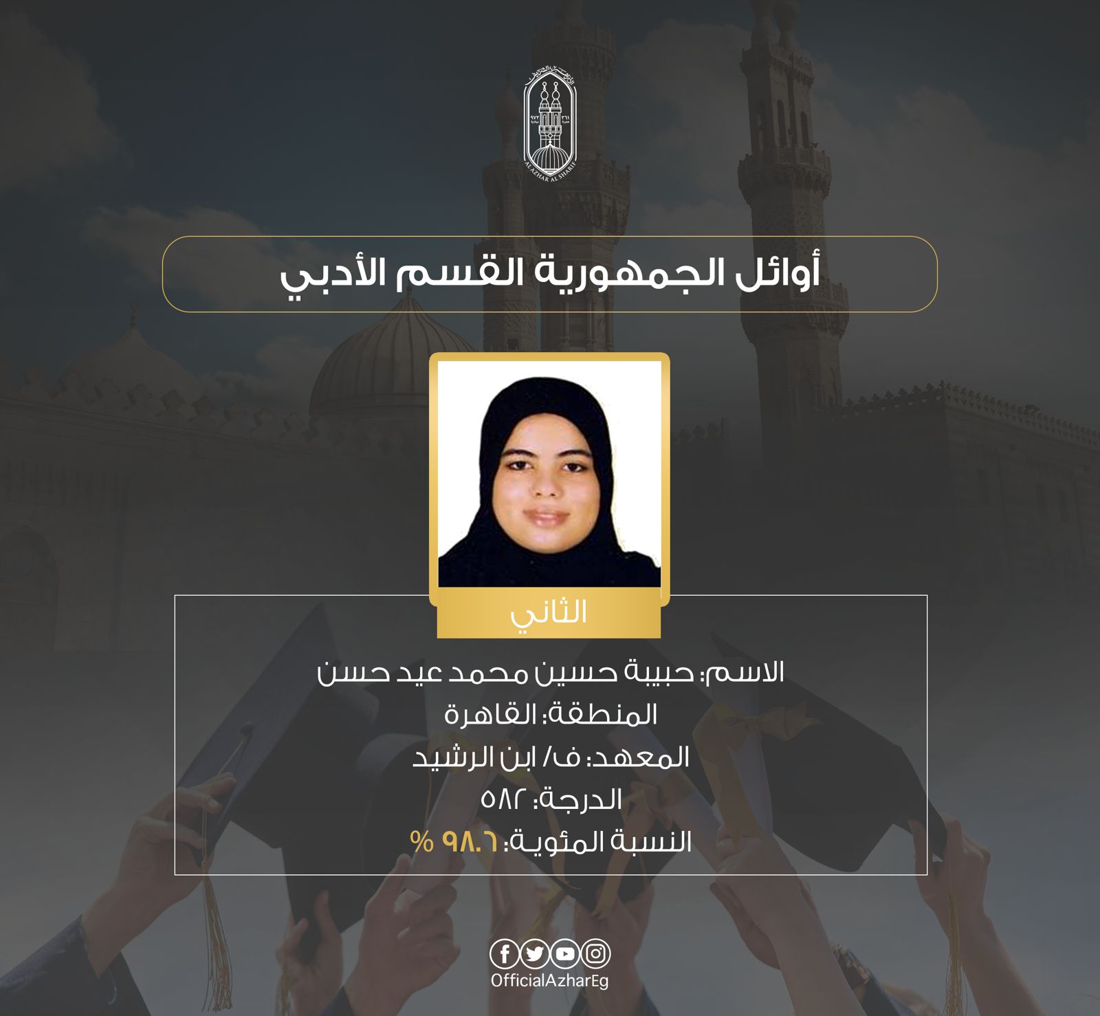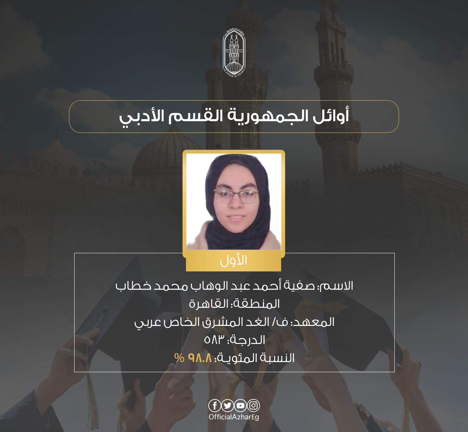 وجاءت قائمة أوائل الثانوية الأزهرية القسم الأدبي الآتي: