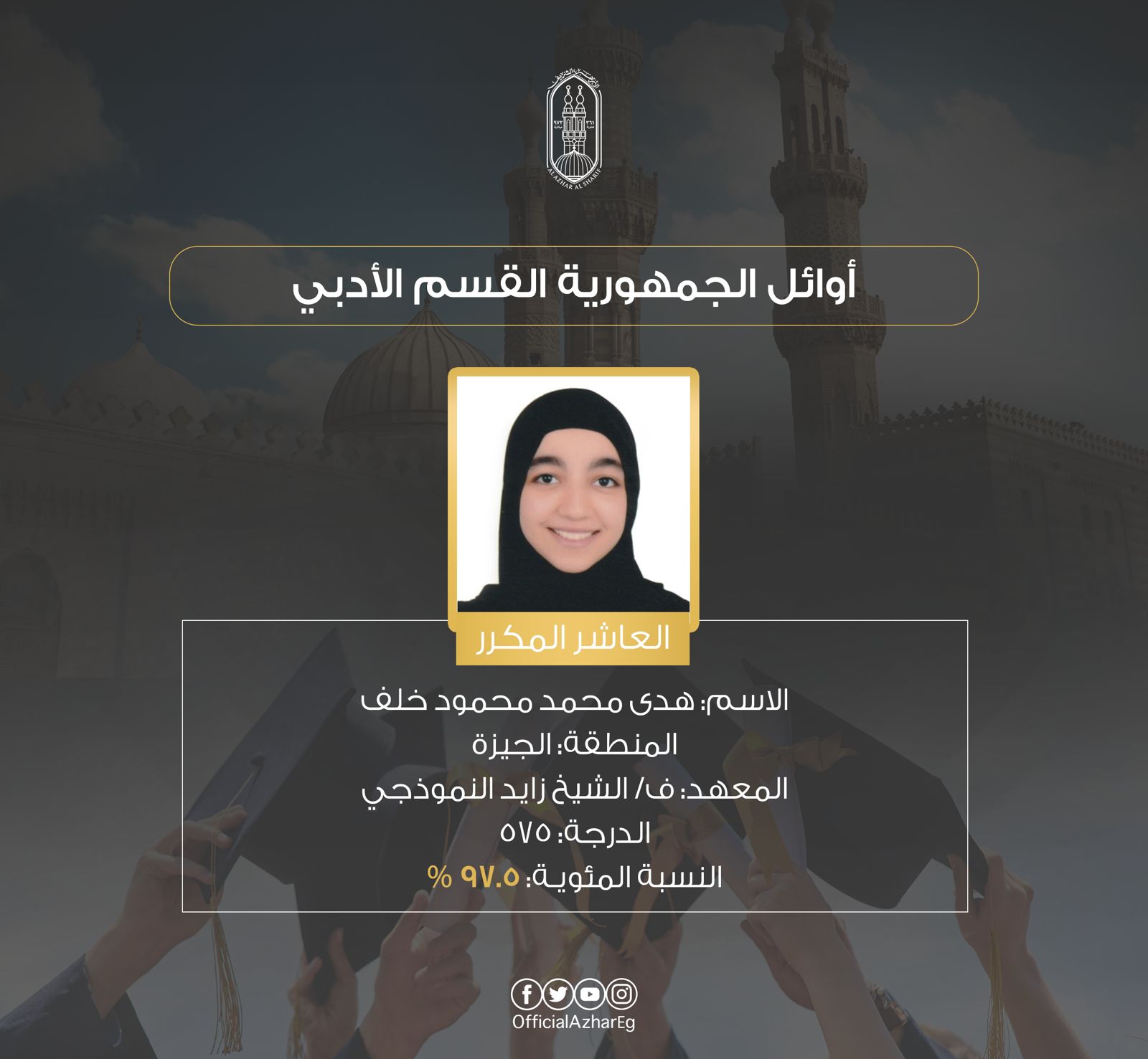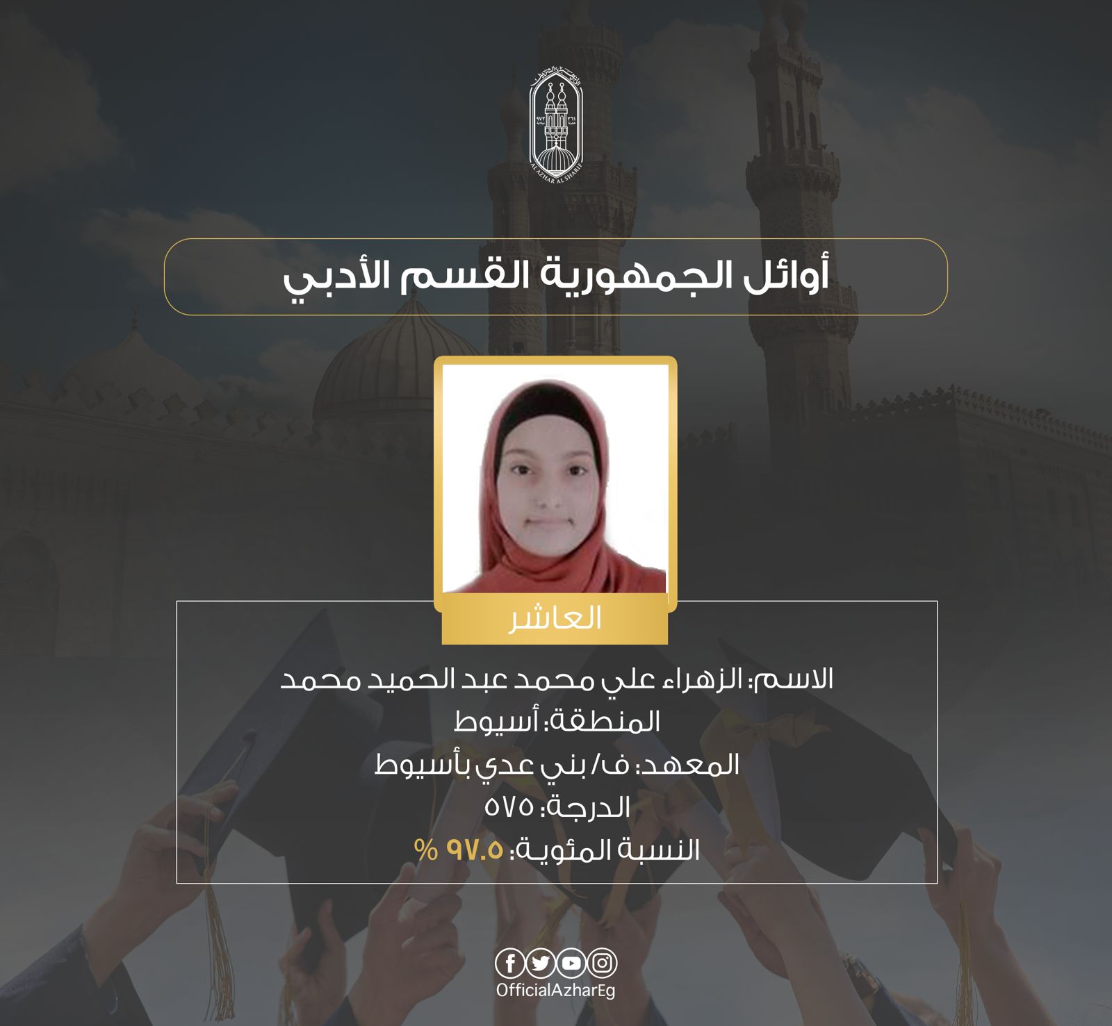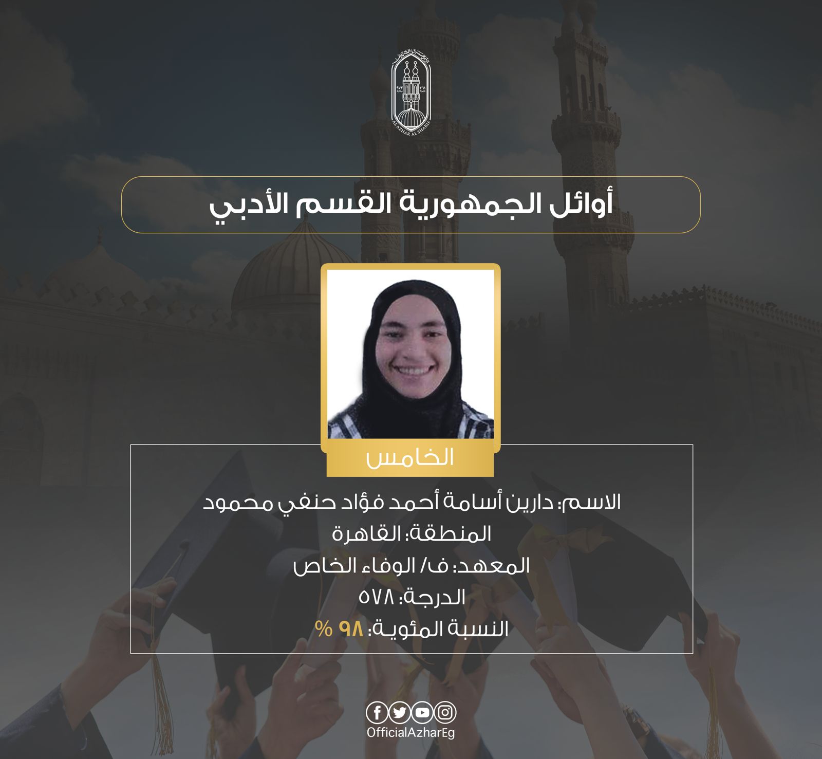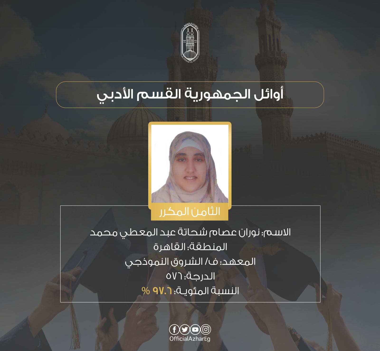 وجاءت قائمة أوائل الثانوية الأزهرية القسم الأدبي الآتي: