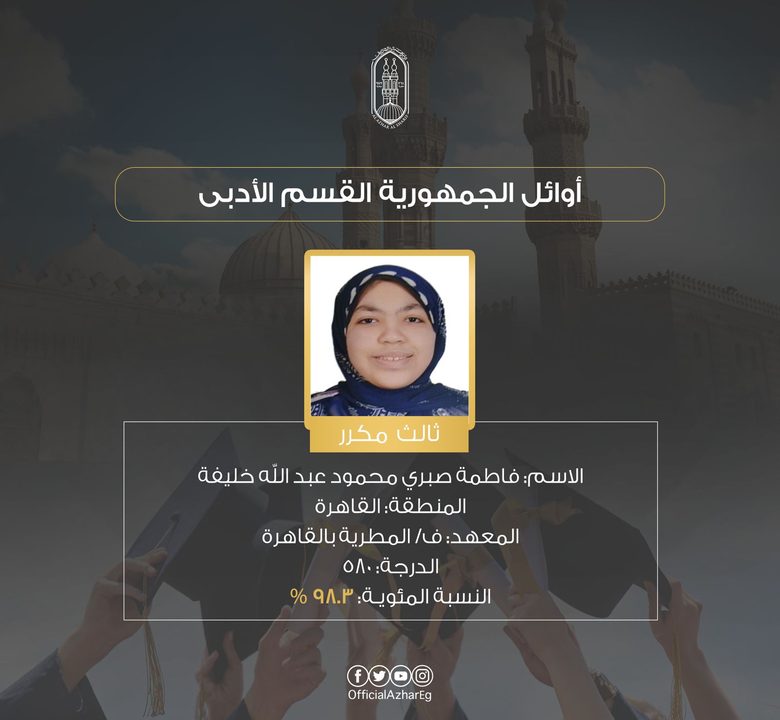أعلن الأزهر شريف أسماء أوائل الثانوية الأزهرية للعام الدراسي 2024/2025 القسم الأدبي وذوي البصيرة “المكفوفين”