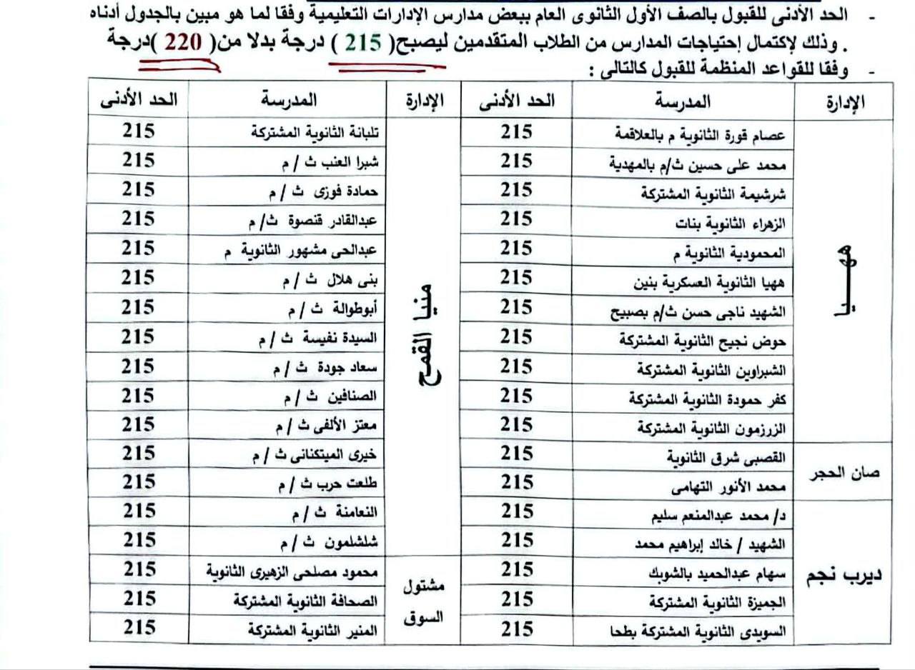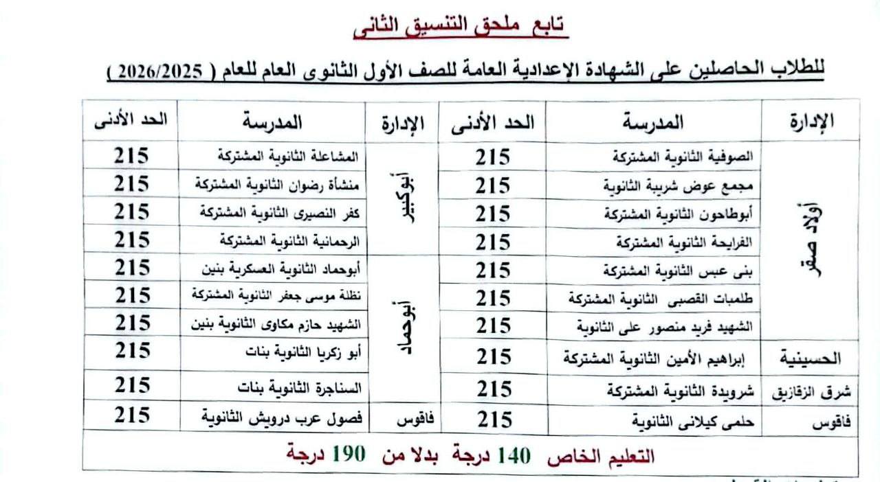 قرر المهندس حازم الأشموني محافظ الشرقية النزول بالحد الأدنى لتنسيق القبول بالصف الأول الثانوي العام للعام الدراسي 2025/ 2026 وذلك للناجحين في الشهادة الإعدادية العامة للعام الدراسي 2024 / 2025 بعدد من المدارس بنطاق المحافظة ليصبح 215 درجة بدلا من 220 درجة طبقًا للكشف المرفق.