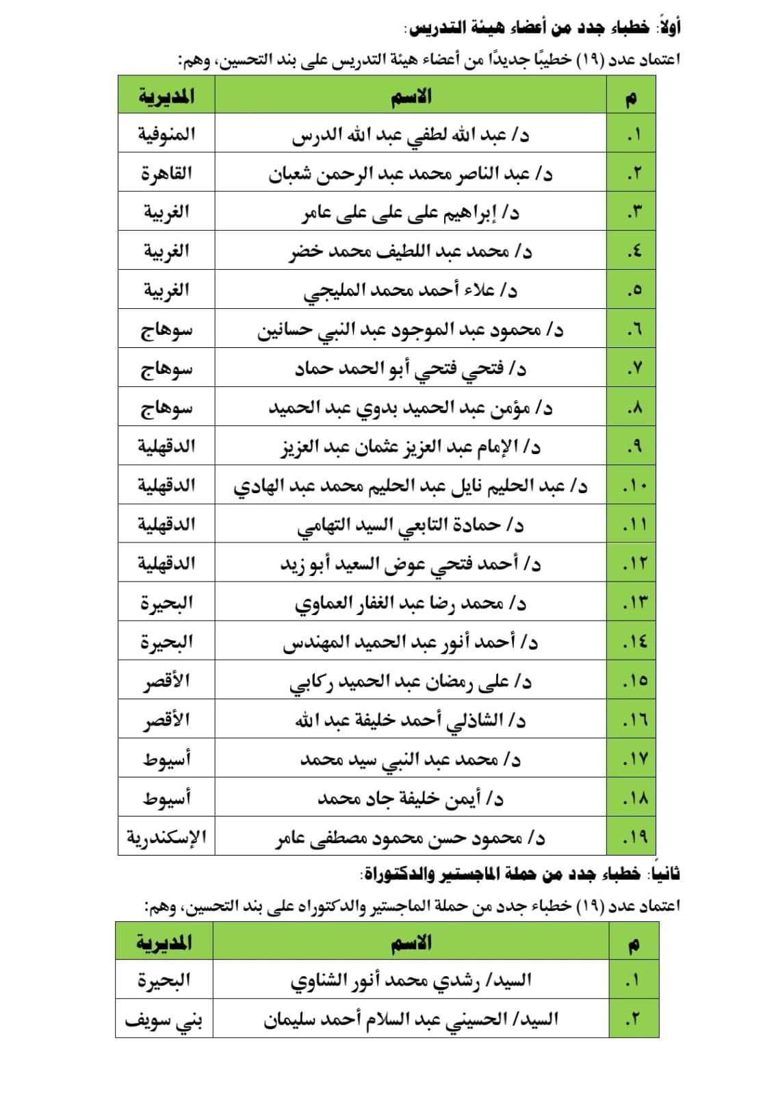 "الأزهري" يعتمد 41 خطيب مكافأة من حملة المؤهلات العليا وأعضاء هيئة التدريس (بالأسماء)