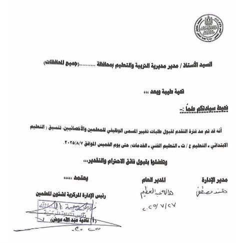 أرسلت وزارة التربية والتعليم والتعليم الفني خطابًا رسميًا إلى المديريات التعليمية، أعلنت فيه مد فترة التقديم لتغيير المسمى الوظيفي للمعلمين بجميع التخصصات.