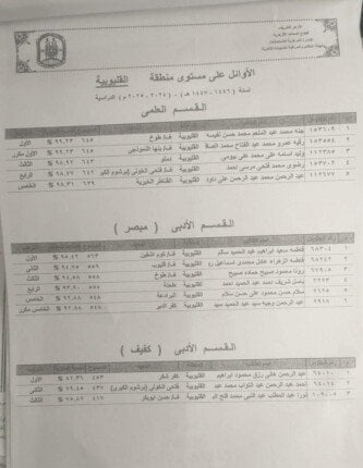 أعلنت الإدارة المركزية للأزهر بالقليوبية قائمة أوائل الثانوية الأزهرية من طلاب شعب العلمي والأدبي والمكفوفين حيث تقاسم الطلاب والطالبات المراكز ليحصل البنين على 7 مقاعد والبنات مثلهم.