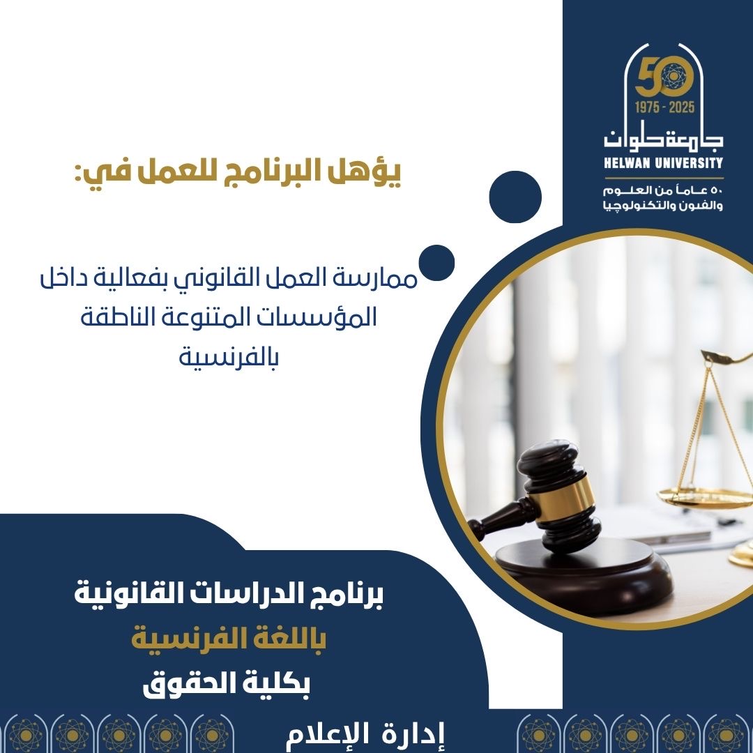 برنامج الدراسات القانونية باللغة الفرنسية بكلية الحقوق جامعة حلوان، هو خيارك الأمثل لتأسيس مستقبل قانوني متميز بلغة عالمية، ولبناء مسار مهني يتوافق مع متطلبات سوق العمل داخل مصر وخارجها.