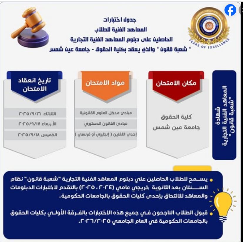 أعلنت أمانة المجلس الأعلى للجامعات عن فتح باب التقدم لاختبارات الدبلومات والمعاهد الفنية للعام الجامعي 2025/2026 للطلاب الحاصلين علي شهادات المعاهد الفنية نظام السنتين وفقًا للشروط والقواعد للقبول بكليات الحقوق وذلك من اعتبارًا من يوم الجمعة الموافق 1/8/2025 على أن يتم غلق الموقع الالكتروني قبل موعد الامتحانات بخمس أيام وفقًا لجداول الاختبارات المعلنة.