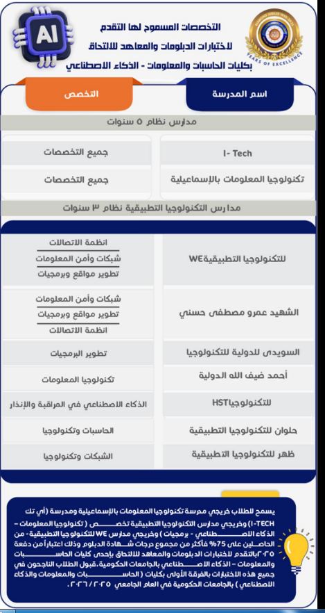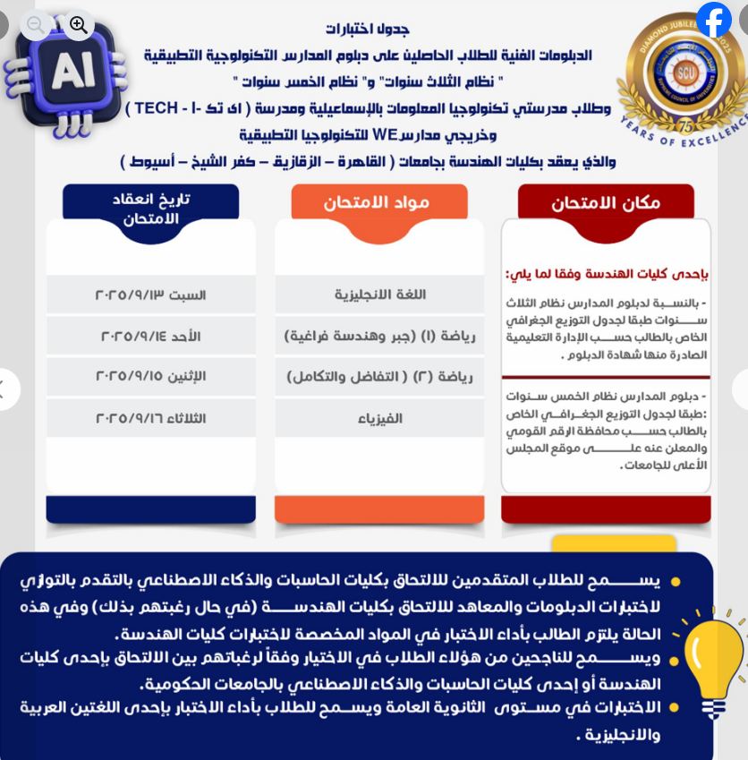 أعلنت أمانة المجلس الأعلى للجامعات عن فتح باب التقدم لاختبارات الدبلومات الفنية للعام الجامعي 2025/2026 للطلاب الحاصلين علي الشهادات الفنية (نظامي الثلاث والخمس سنوات) وفقًا للشروط والقواعد للقبول بإحدي كليات الحاسبات والذكاء الاصطناعي وذلك من اعتبارًا من يوم الجمعة الموافق 1/8/2025 على أن يتم غلق الموقع الالكتروني قبل موعد الامتحانات بخمس أيام وفقا لجداول المدارس ومواعيد الاختبارات المعلنة.