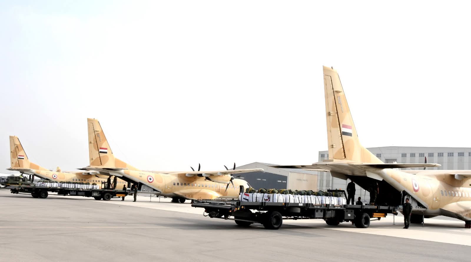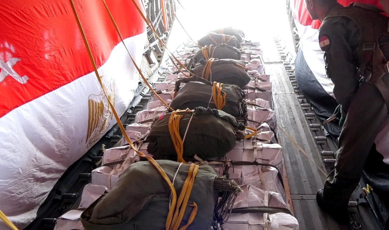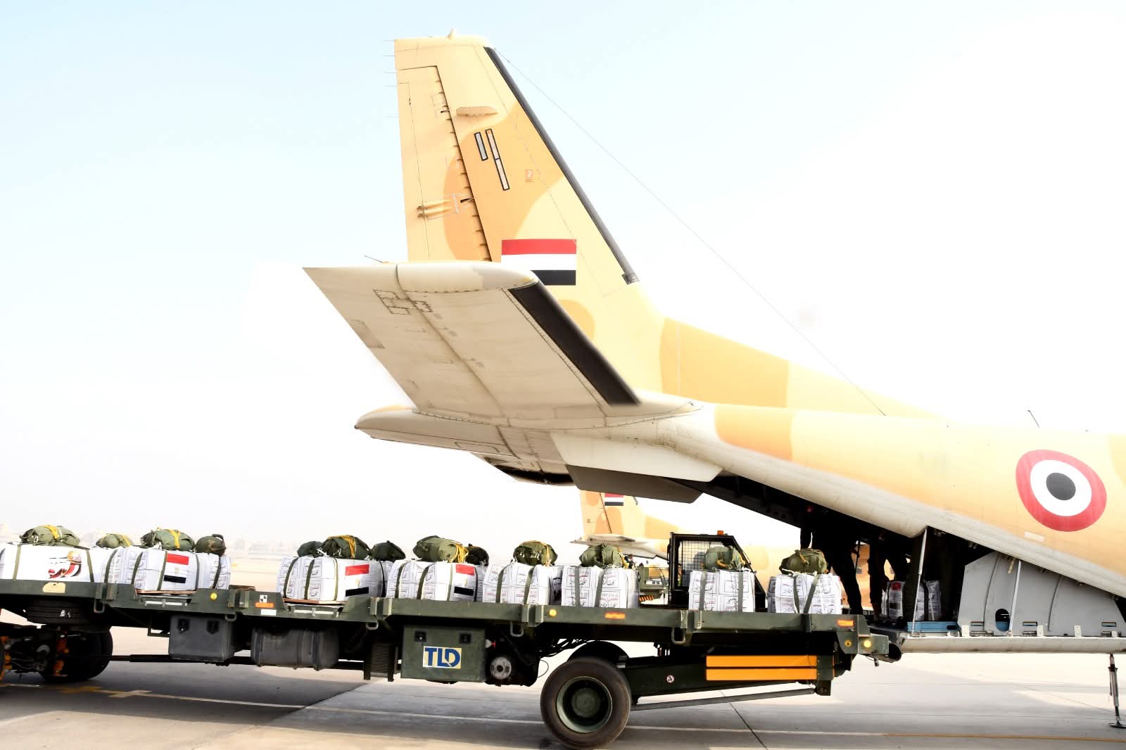 أقلعت 4 طائرات نقل عسكرية من جمهورية مصر العربية محملة بأطنان من المساعدات الغذائية لتنفيذ أعمال الإسقاط الجوى على المناطق التى يصعب الوصول إليها برًا بقطاع غزة، وذلك لتخفيف حدة الأوضاع المعيشية الصعبة ونقص الإحتياجات الإنسانية التى يعانى منها سكان القطاع، هذا بالتزامن مع إستمرار تقديم المساعدات برًا.