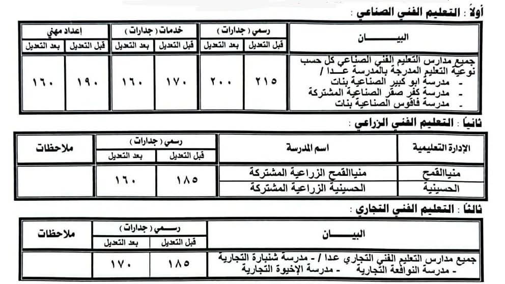 قرر المهندس حازم الأشموني محافظ الشرقية النزول بالحد الأدنى لتنسيق القبول بالصف الأول الثانوي الفني ( صناعي – زراعي – تجاري) للعام الدراسي 2025/ 2026 وذلك للناجحين في الشهادة الإعدادية العامة للعام الدراسي 2024 / 2025 بعدد من المدارس بنطاق المحافظة طبقا للكشف المرفق.