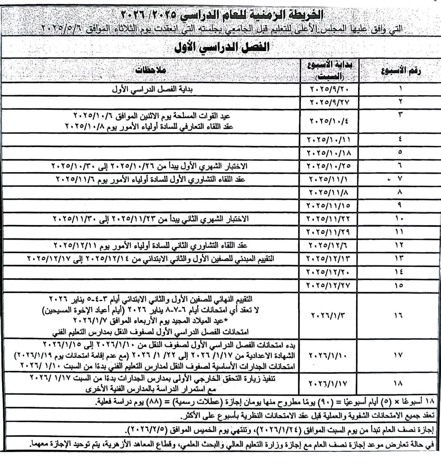 - يبدأ العام الدراسي الجديد يوم السبت الموافق 20 سبتمبر 2025، ويستمر حتى الخميس 11 يونيو 2026، بإجمالي 36 أسبوعًا دراسيًا.