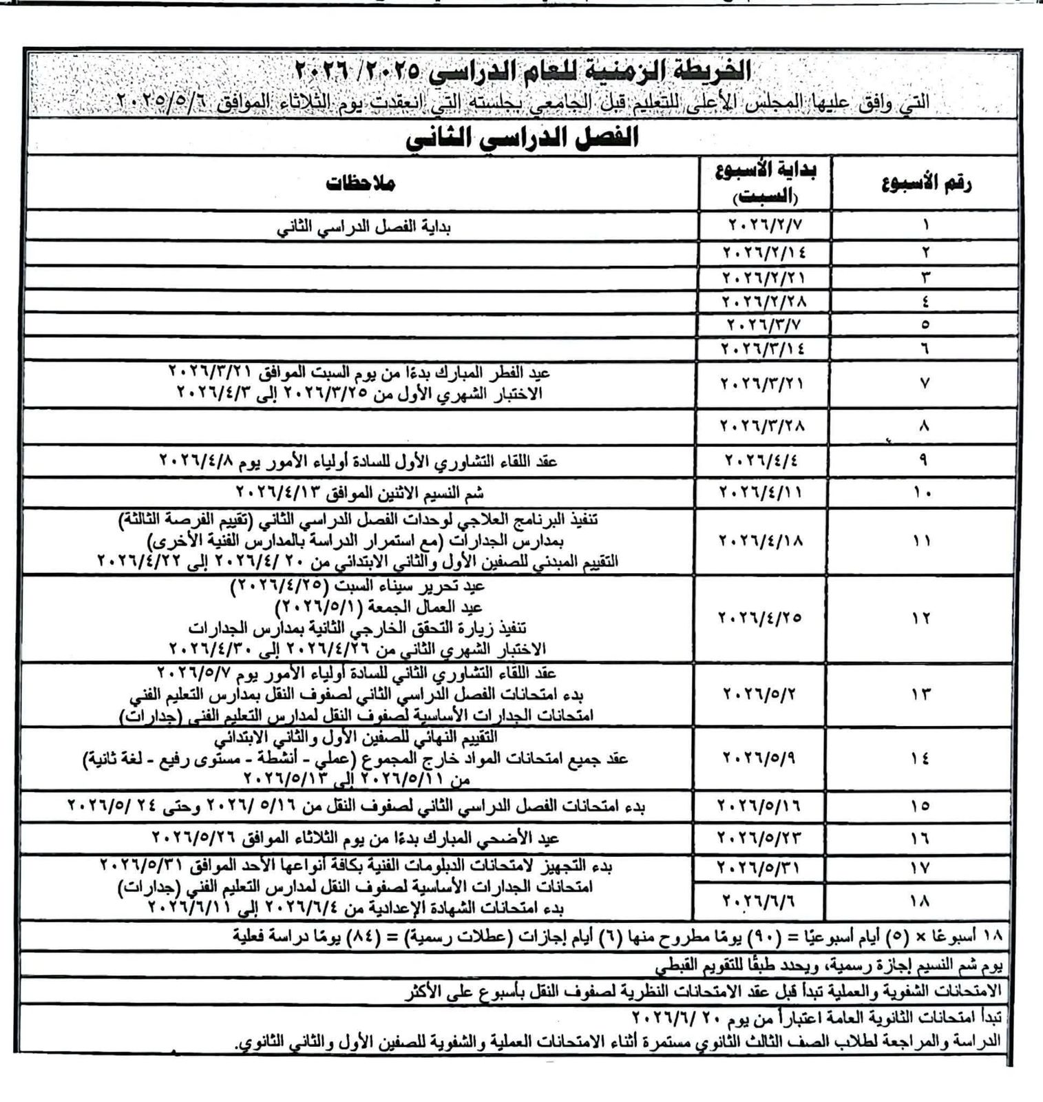 - الفصل الدراسي الثاني سيبدأ يوم السبت الموافق 7 فبراير 2026، ويُختتم يوم الخميس 11 يونيو 2026.