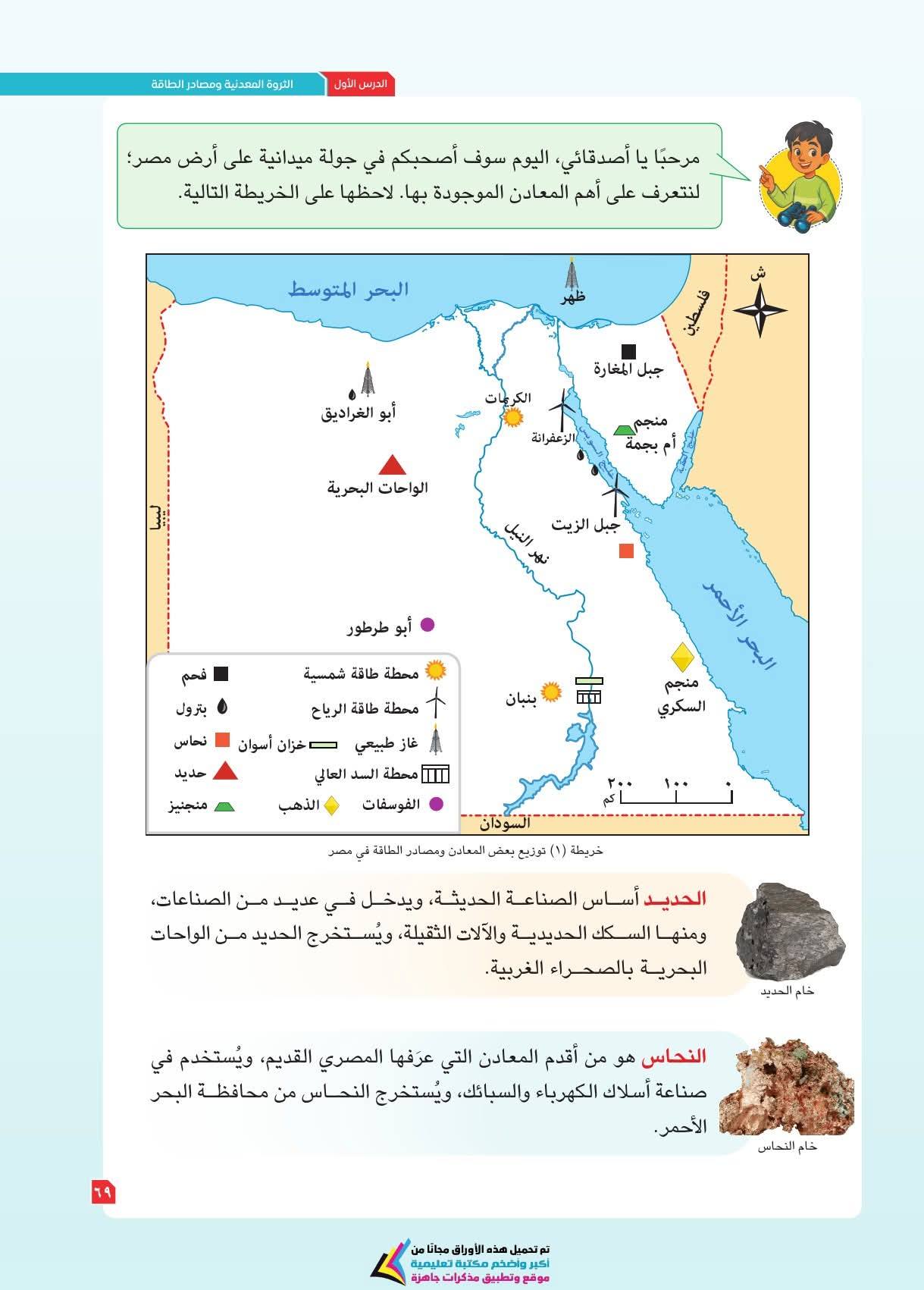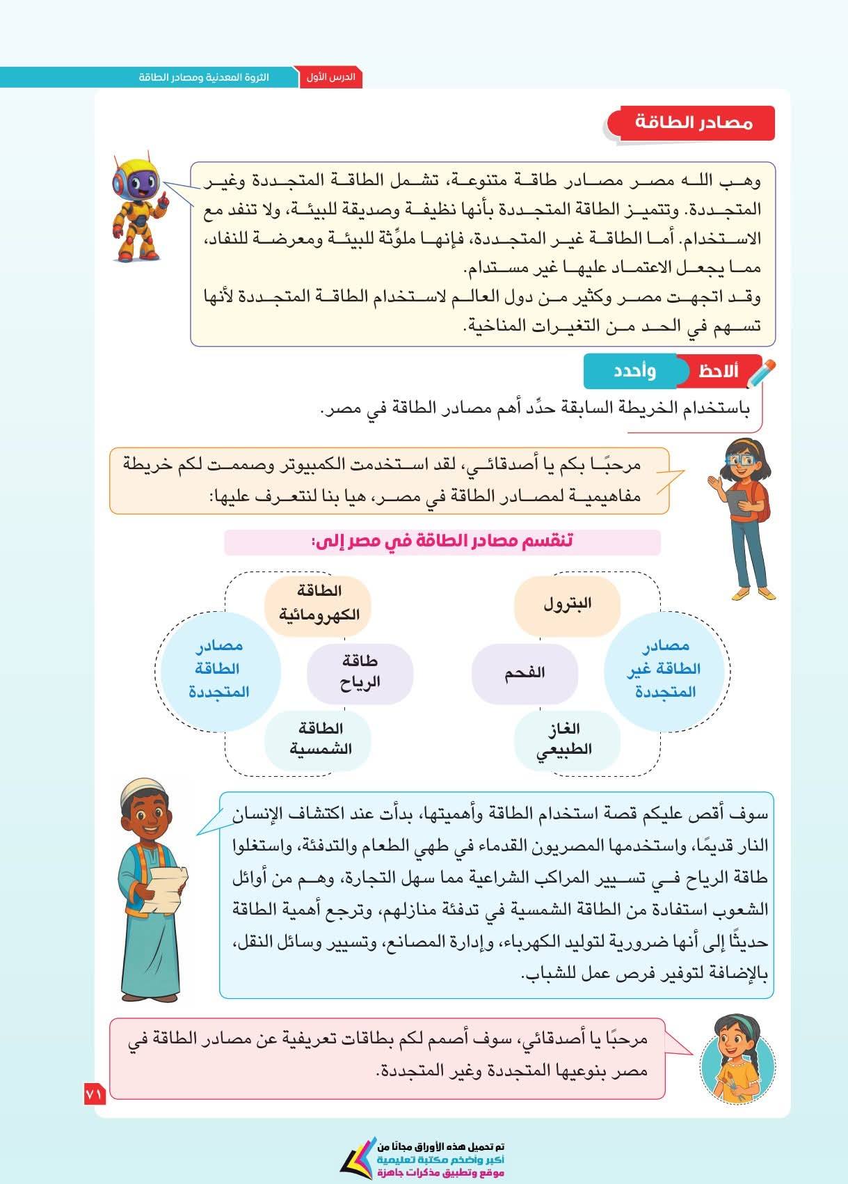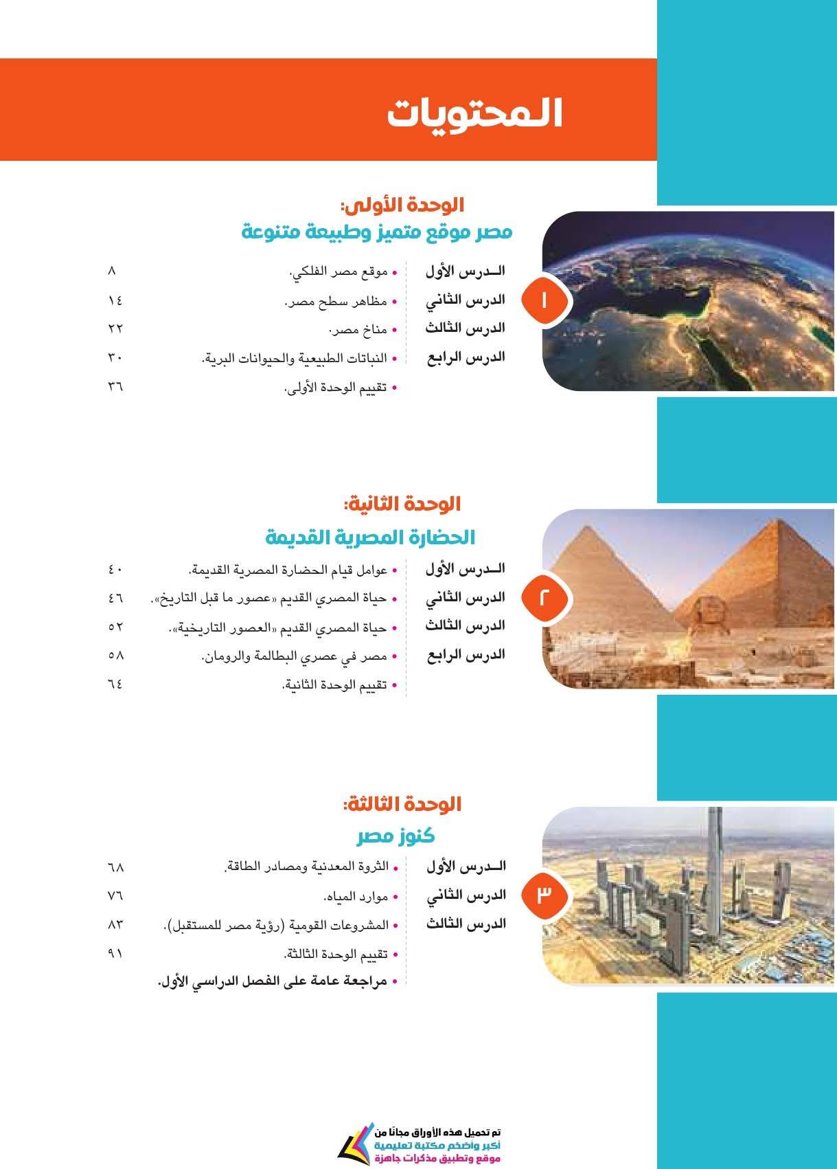ويعزز الكتاب مهارات التفكير الجغرافي والتاريخي، مثل فهم العلاقات بين الإنسان والبيئة، والتغير عبر الزمن، وتحليل الرسوم والخرائط والنصوص التاريخية، بالإضافة لمهارات التفكير الناقد والتفكير الإبداعي وحل المشكلات، وذلك من خلال دروس تجمع بين المعرفة والتشويق، تتعلمون فيها موقع مصر الفلكي ومظاهر سطح مصر وخصائص مناخها وما تزخر به من نباتات طبيعية وحيوانات برية.