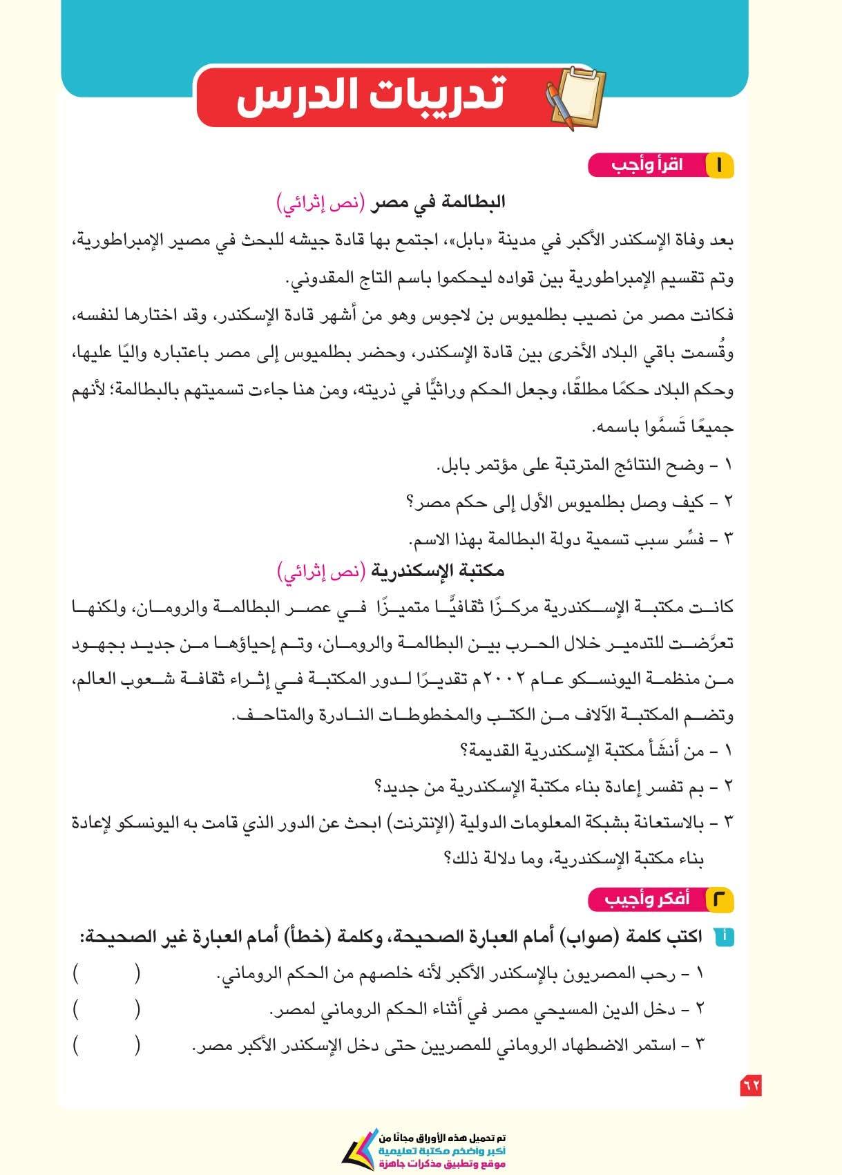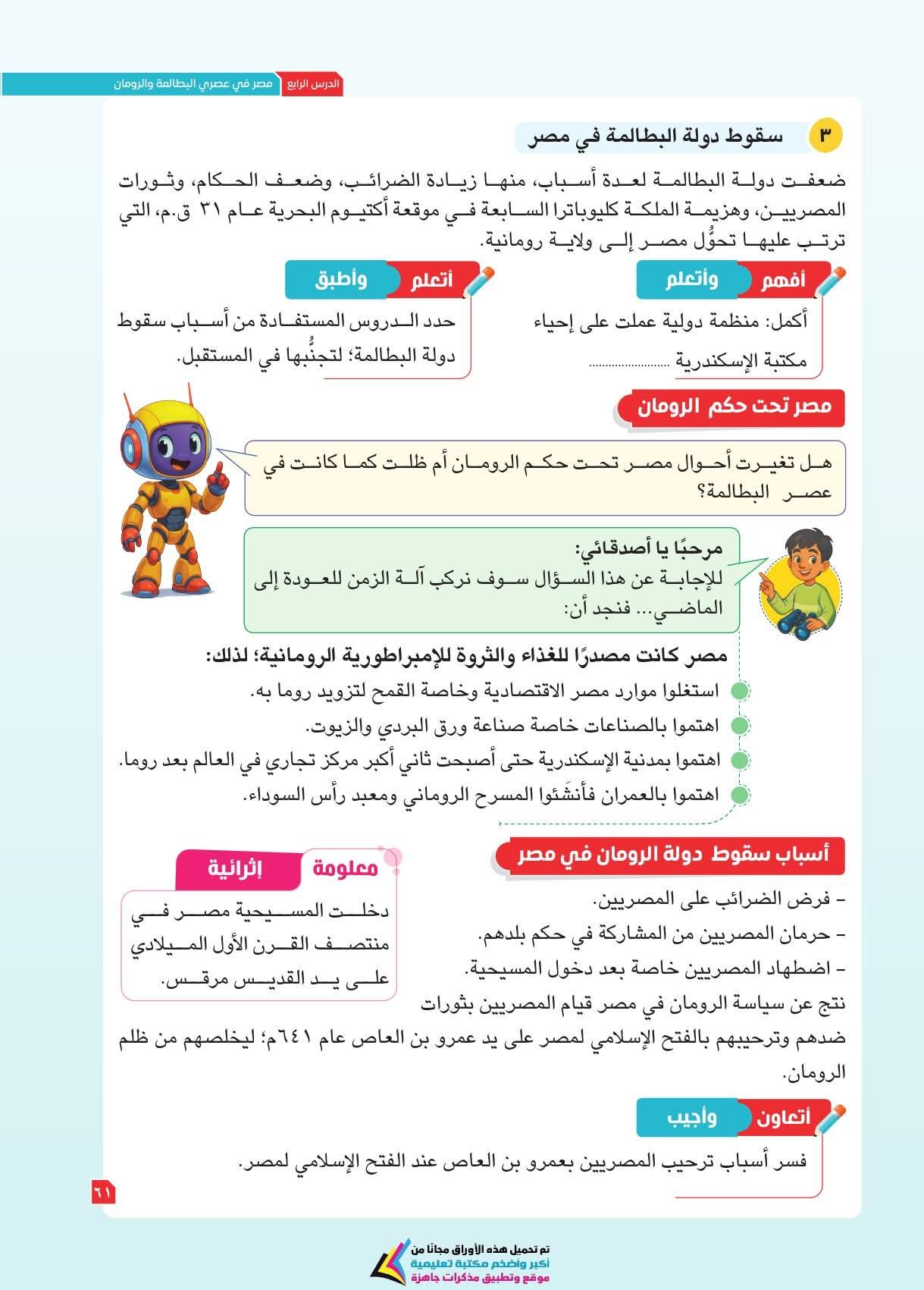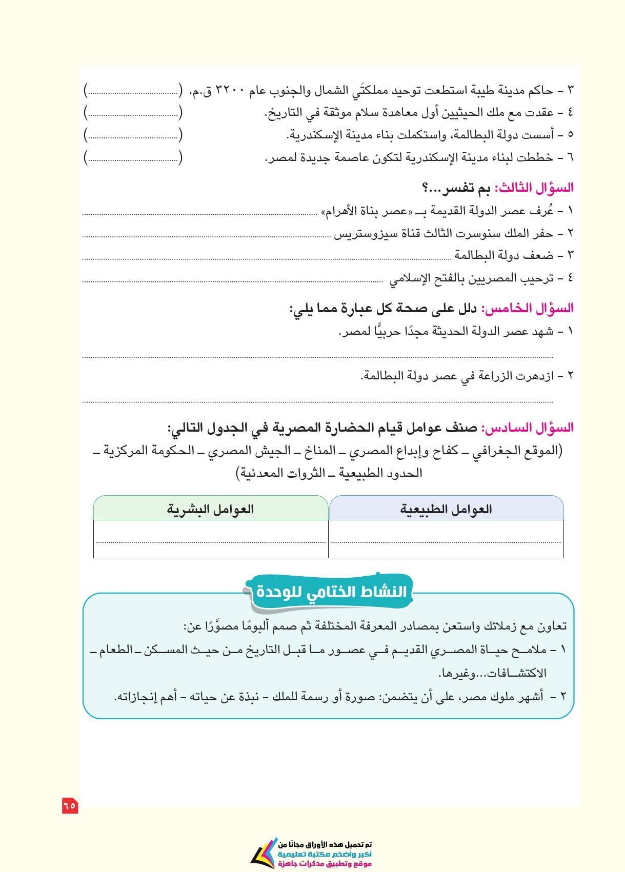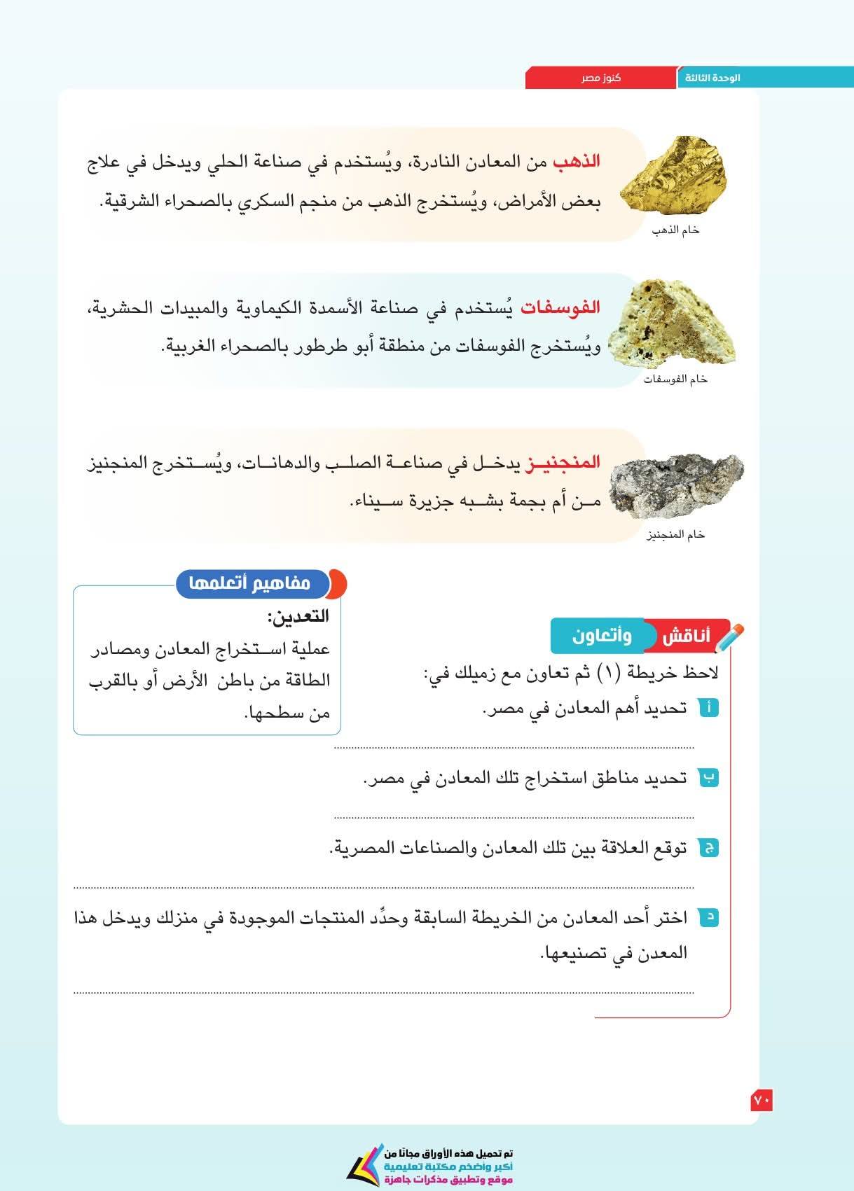 ويعزز الكتاب مهارات التفكير الجغرافي والتاريخي، مثل فهم العلاقات بين الإنسان والبيئة، والتغير عبر الزمن، وتحليل الرسوم والخرائط والنصوص التاريخية، بالإضافة لمهارات التفكير الناقد والتفكير الإبداعي وحل المشكلات، وذلك من خلال دروس تجمع بين المعرفة والتشويق، تتعلمون فيها موقع مصر الفلكي ومظاهر سطح مصر وخصائص مناخها وما تزخر به من نباتات طبيعية وحيوانات برية.