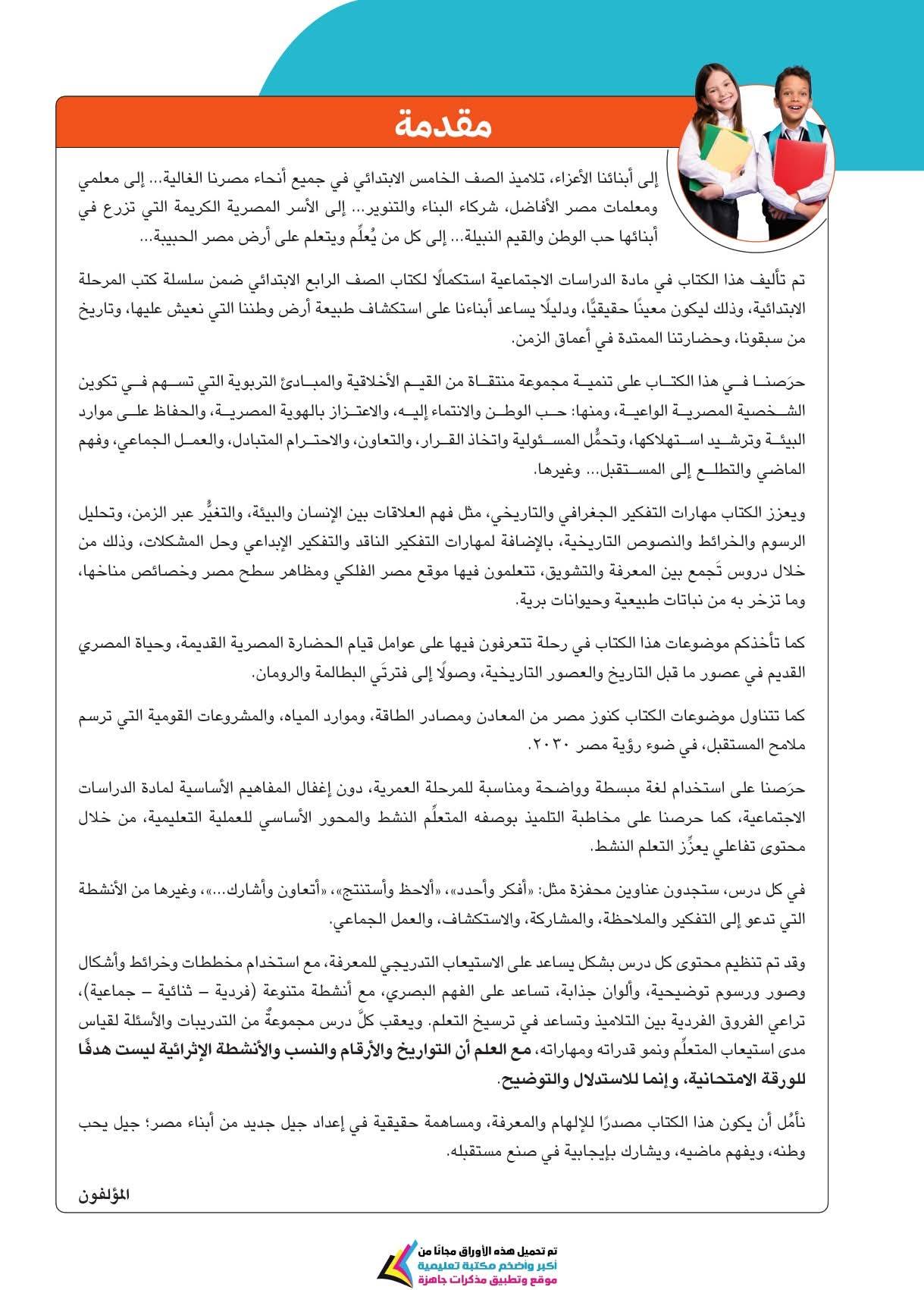 ويحرص كتاب الدراسات لطلاب الصف الخامس الابتدائي على تنمية مجموعة منتقاة من القيم الأخلاقية والمبادئ التربوية التي تسهم في تكوين الشخصية المصرية الواعية، ومنها حب الوطن والانتماء إليه، والاعتزاز بالهوية المصرية، والحفاظ على موارد البيئة وترشيد استهلاكها، وتحمل المسئولية واتخاذ القرار، والتعاون والاحترام المتبادل، والعمل الجماعي، وفهم الماضي والتطلع إلى المستقبل... وغيرها.
