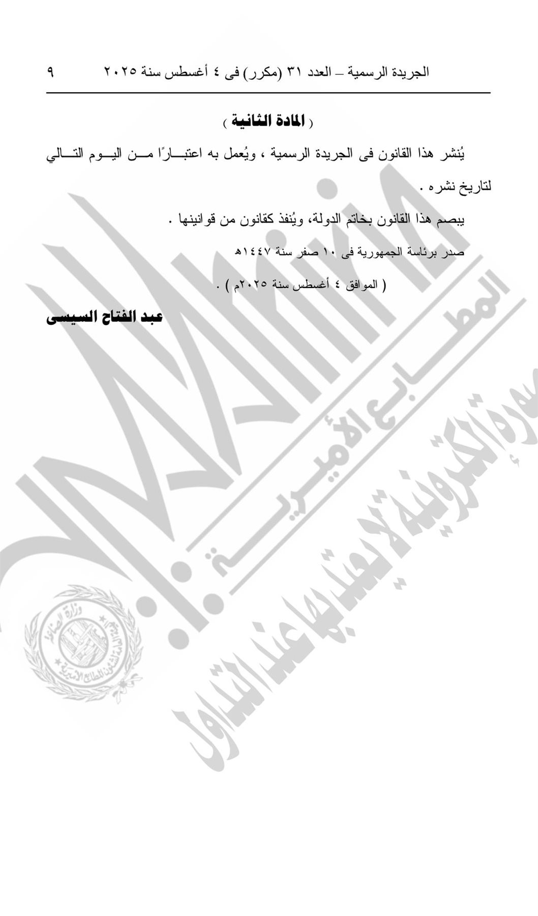 - المادة الثانية: يُنشر هذا القانون في الجريدة الرسمية، ويُعمل به اعتبارًا من اليوم التالي لتاريخ نشره.