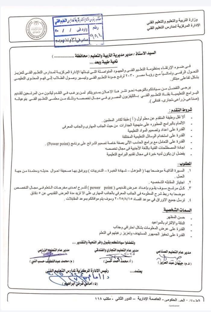 وجهت وزارة التربية والتعليم والتعليم الفني، من يرغب في التقدم ليكون من المرشحين لتقديم البرامج التعليمية بقناة التعليم الفني بالتليفزيون المصرى في مجال تخصصه وذلك من معلمي التعليم الفني بنوعياته صناعی زراعی - تجاری فندقی ).