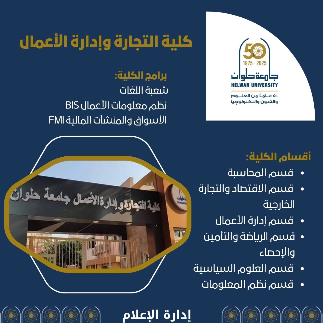 تبرز كلية التجارة وإدارة الأعمال جامعة حلوان كواحدة من الكليات الرائدة التي تجمع بين التاريخ العريق والتحديث المستمر، فمنذ نشأتها بقرار من رئيس مجلس الوزراء رقم 924 لسنة 1975، وضعت الكلية نصب أعينها إعداد كوادر مؤهلة تمتلك الكفاءة العلمية والعملية في مجالات الإدارة والمحاسبة والتجارة الخارجية، بما يواكب متطلبات سوق العمل المتغير.
