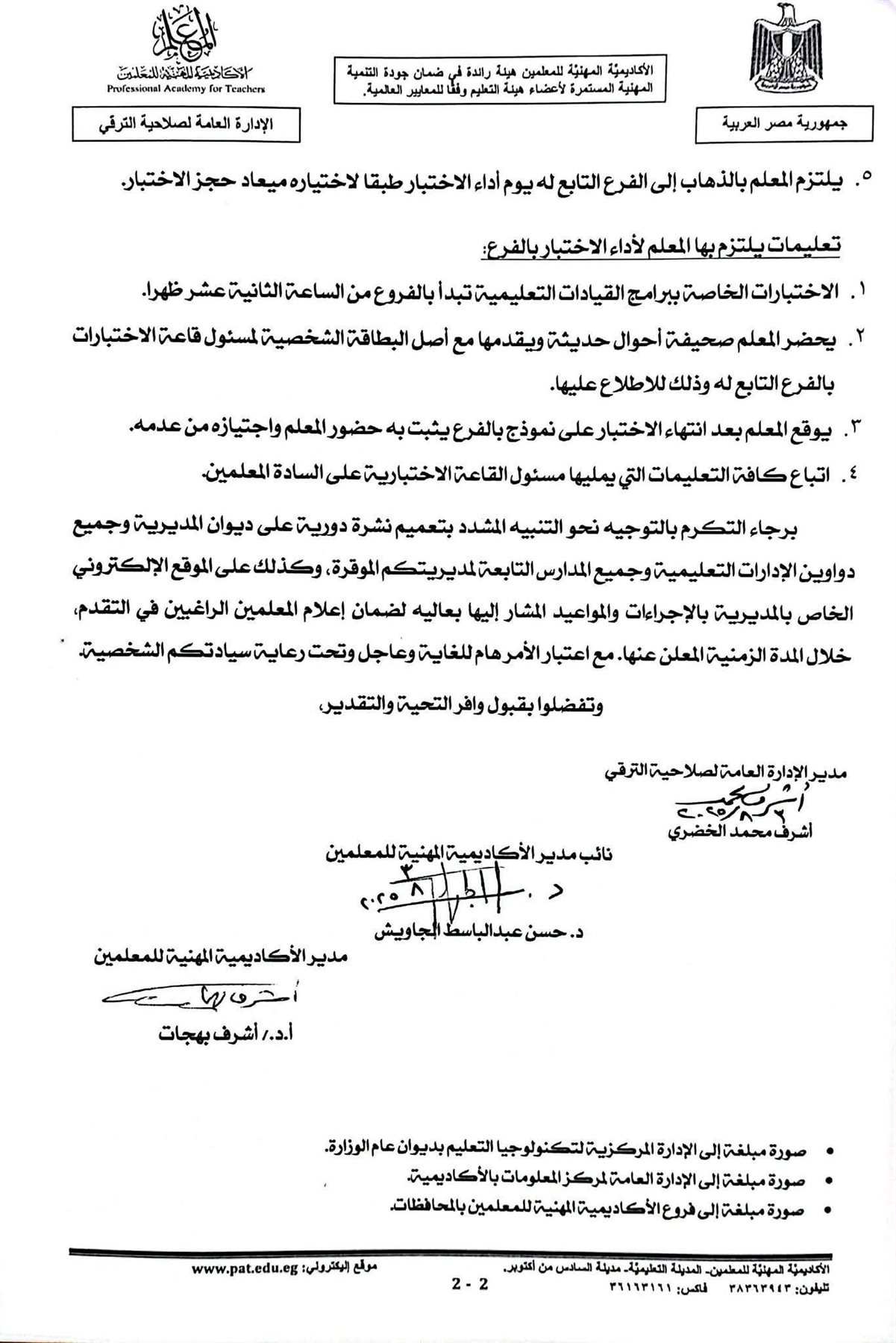 - يلتزم المعلم بالذهاب إلى الفرع التابع له يوم أداء الاختبار طبقا لاختياره ميعاد حجز الاختبار.
