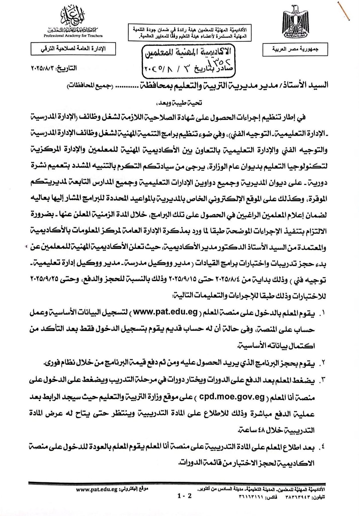 أعلنت الأكاديمية المهنية للمعلمين عن بدء حجز تدريبات واختبارات برامج القيادات ( مدير ووكيل مدرسة - مدير ووكيل إدارة تعليمية. توجيه فني ) وذلك بداية من ۲۰۲۵/۸/٤ حتى ۲۰۲۵/۹/۱۵ وذلك بالنسبة للحجز والدفع، وحتى ۲۰۲۵/۹/۲۵ للاختبارات وذلك طبقا للإجراءات والتعليمات التالية: