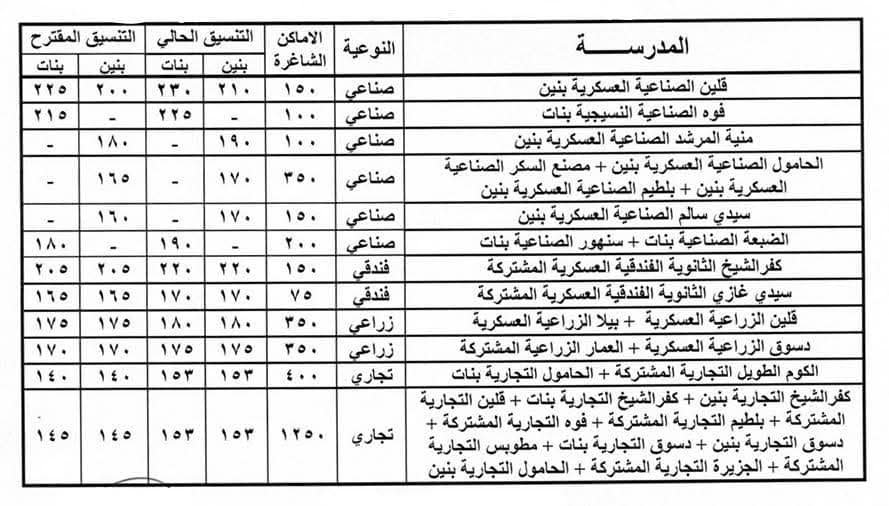 وفيما يخص التعليم الثانوي الفني، أعلن محافظ كفرالشيخ أنه تم النزول بدرجات القبول بمدارس التعليم الفني بنوعياته (الصناعي – الزراعي – التجاري – الفندقي)، وذلك في ضوء أعداد المتقدمين خلال المرحلة الأولى من التنسيق الإلكتروني التي امتدت من 7 يوليو وحتى 30 يوليو 2025، مؤكدًا أن النزول بالتنسيق الفني يشترط عدم التحويل طوال مدة الدراسة، ويُتاح فقط بالمدارس التي وردت في الجداول المعتمدة (المرفقة).