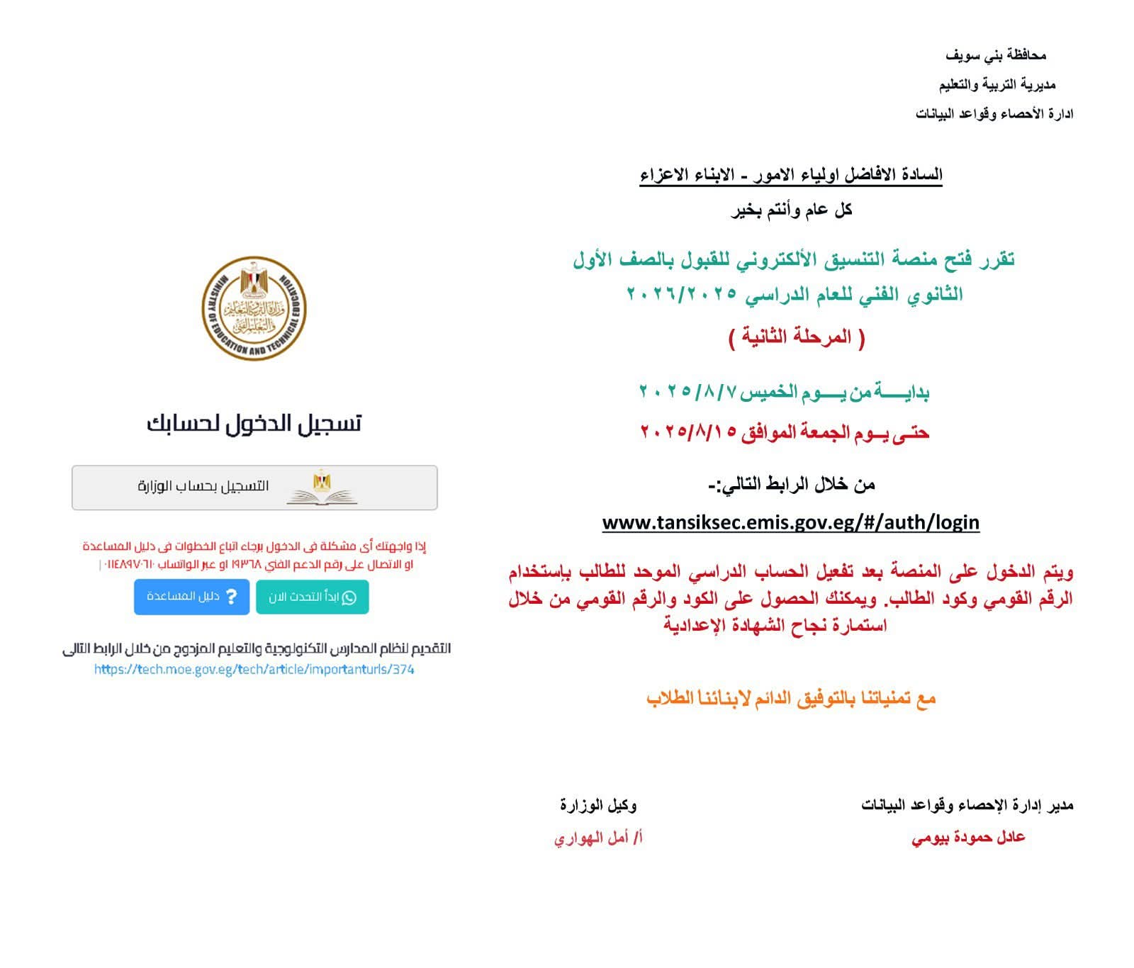 أعلنت مديرية التربية والتعليم والتعليم الفني بمحافظة بني سويف، بأنه تقرر فتح منصة التنسيق الإلكتروني لـ التقديم للصف الأول الثانوى الفني " المرحلة الثانية " للعام الدراسي الجديد 2026/2025.