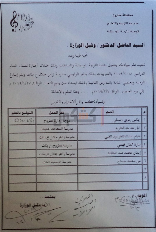 الموسيقية، على تفعيل نشاط التربية الموسيقية خلال أجازة نصف العام وطوال العام الدراسى،