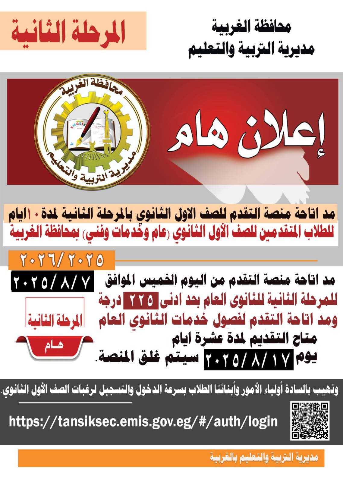 أعلنت مديرية التربية والتعليم والتعليم الفني بمحافظة الغربية، مد فترة التقديم الإلكتروني للمرحلة الثانية للالتحاق بالصف الأول الثانوي (عام – فني – خدمات) للعام الدراسي 2025 / 2026.