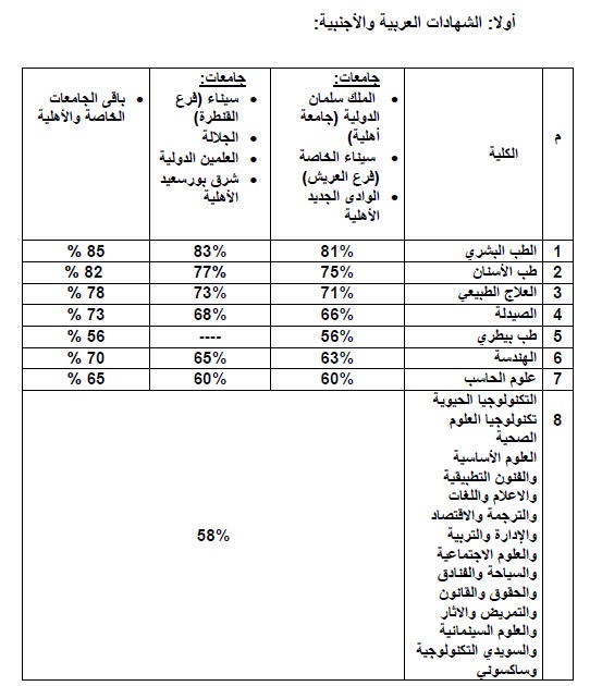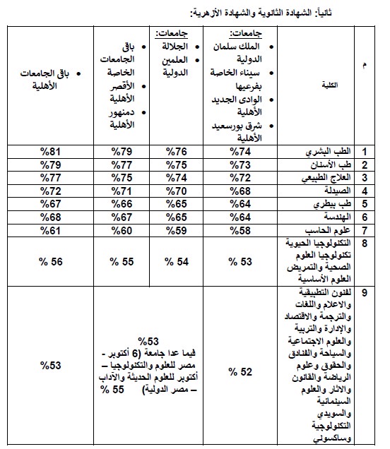 • بالنسبة لطلاب مدارس النيل فان نسبة الحدود الدنيا للثانوية العامة تسري أيضا على هؤلاء الطلاب.
