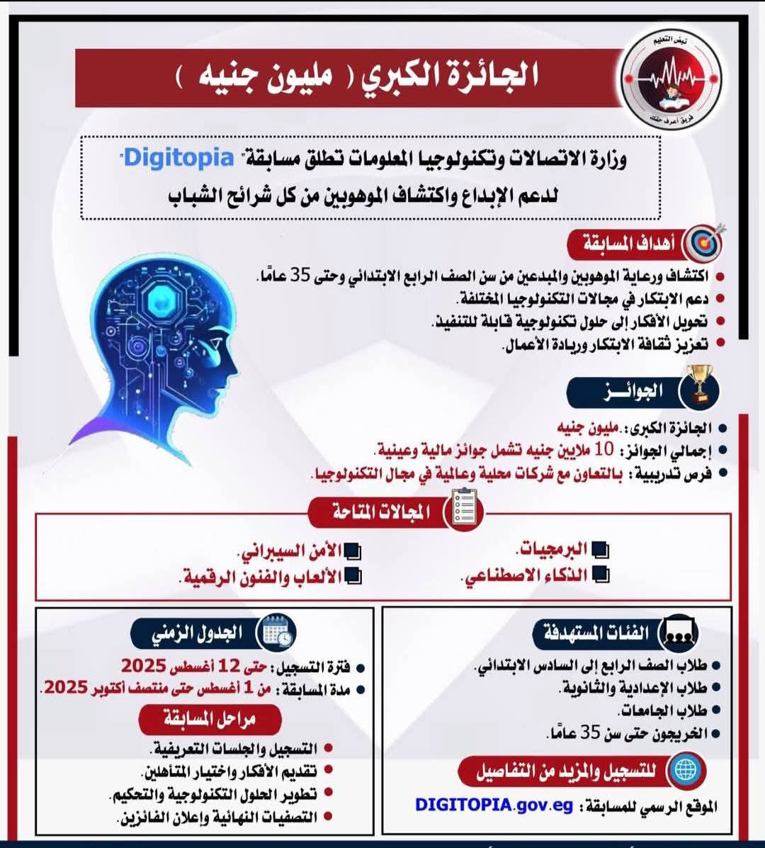 1- يقوم الطالب بالتسجيل في المسابقة على موقع وزارة الاتصالات من خلال الرابط التالي:  DIGITOPIA.gov.eg والتقديم متاح حتى يوم 12 / 8 / 2025م