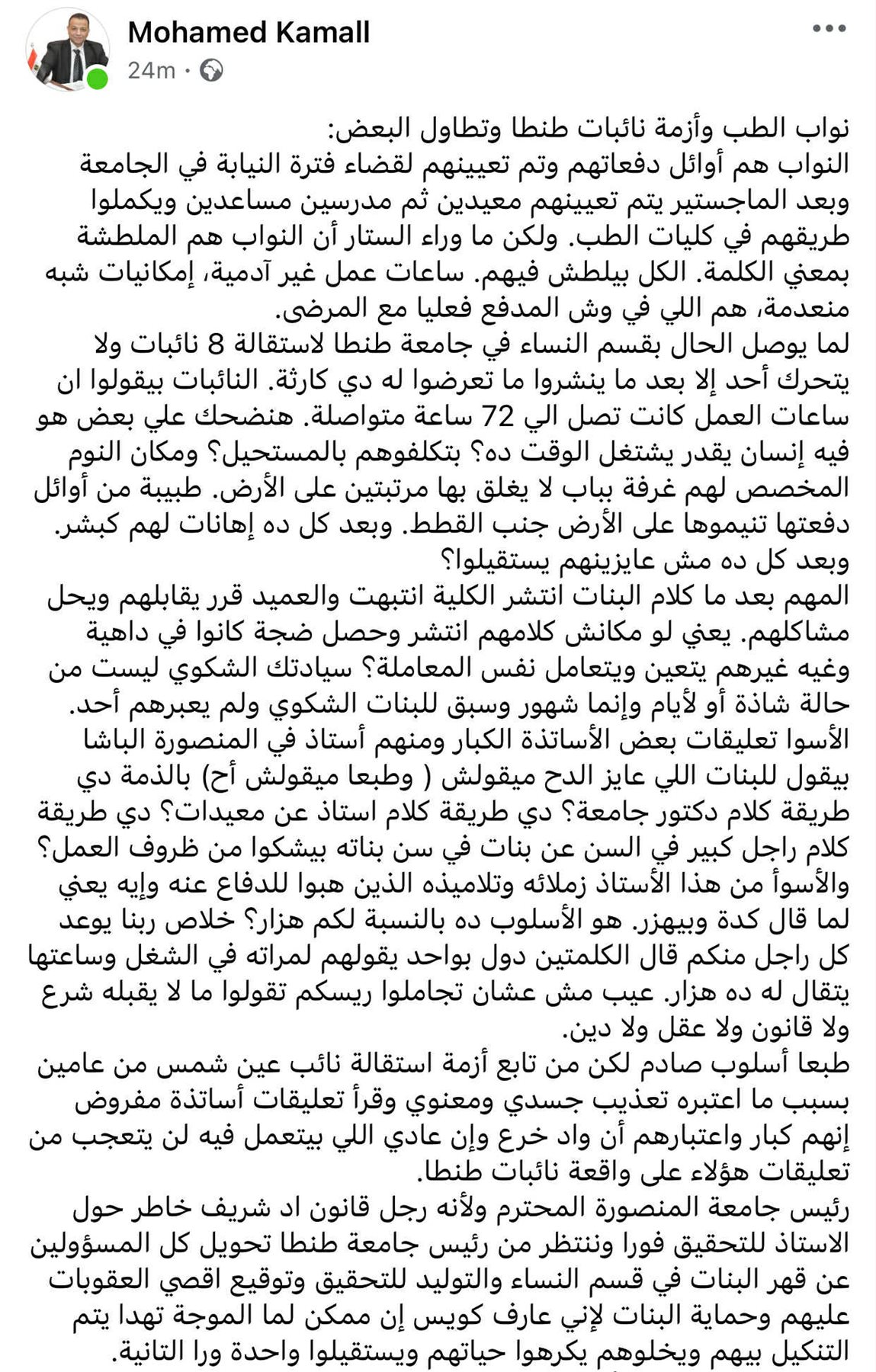 وانتقد كمال، تأخر تحرك إدارة الكلية لحل الأزمة إلا بعد انتشار قصص النائبات على مواقع التواصل الاجتماعي، مؤكدًا أن الشكوى ليست حادثة فردية أو طارئة، بل ممتدة منذ شهور، ولم تلقَ أي استجابة.