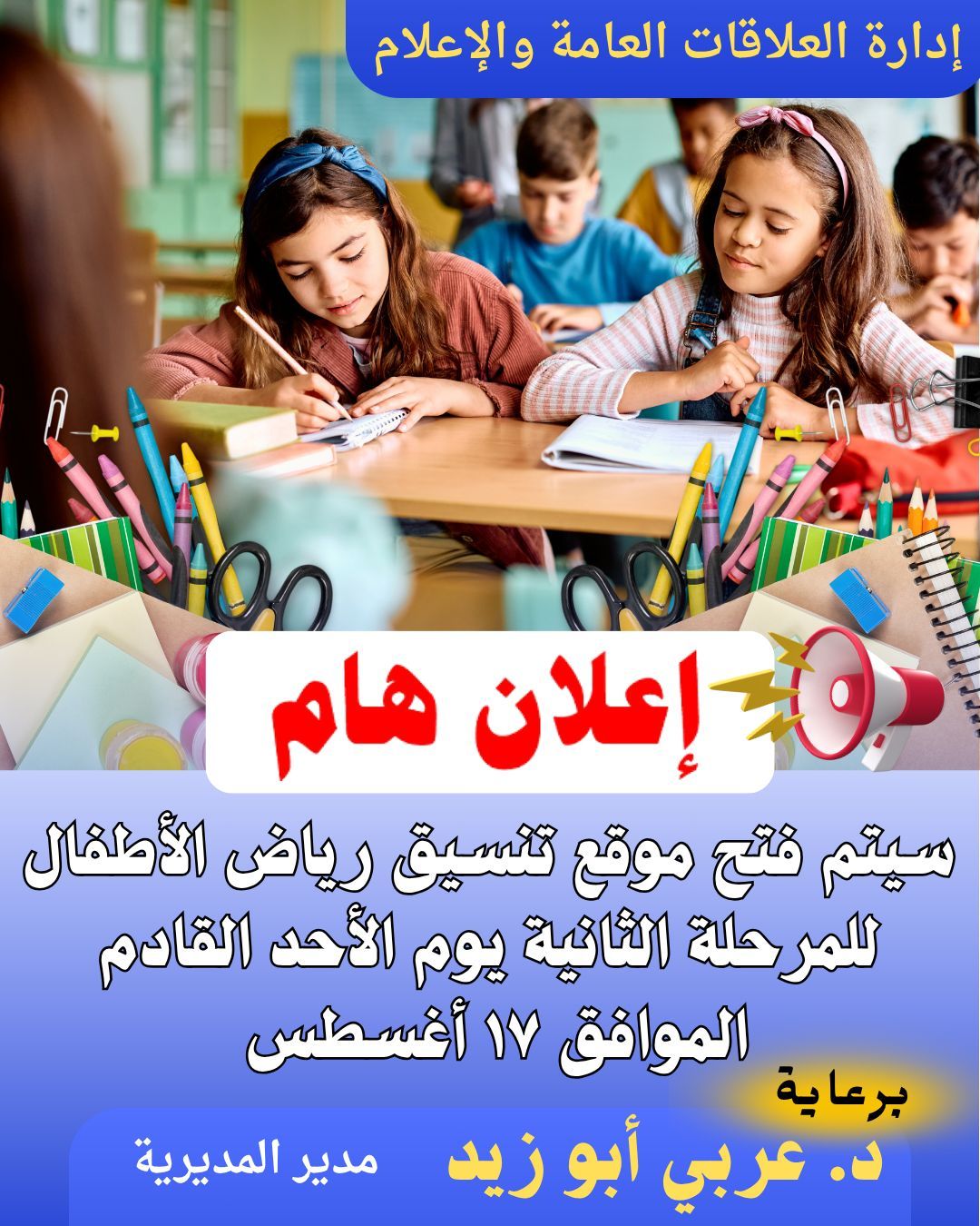 أعلنت مديرية التربية والتعليم والتعليم الفني بمحافظة الإسكندرية، فتح موقع المديرية لـ المرحلة الثانية من تنسيق رياض الأطفال للمدارس الرسمية لغات والرسمية المتميزة لغات اعتبارا من يوم الأحد المقبل الموافق ١٧ من أغسطس ٢٠٢٥.