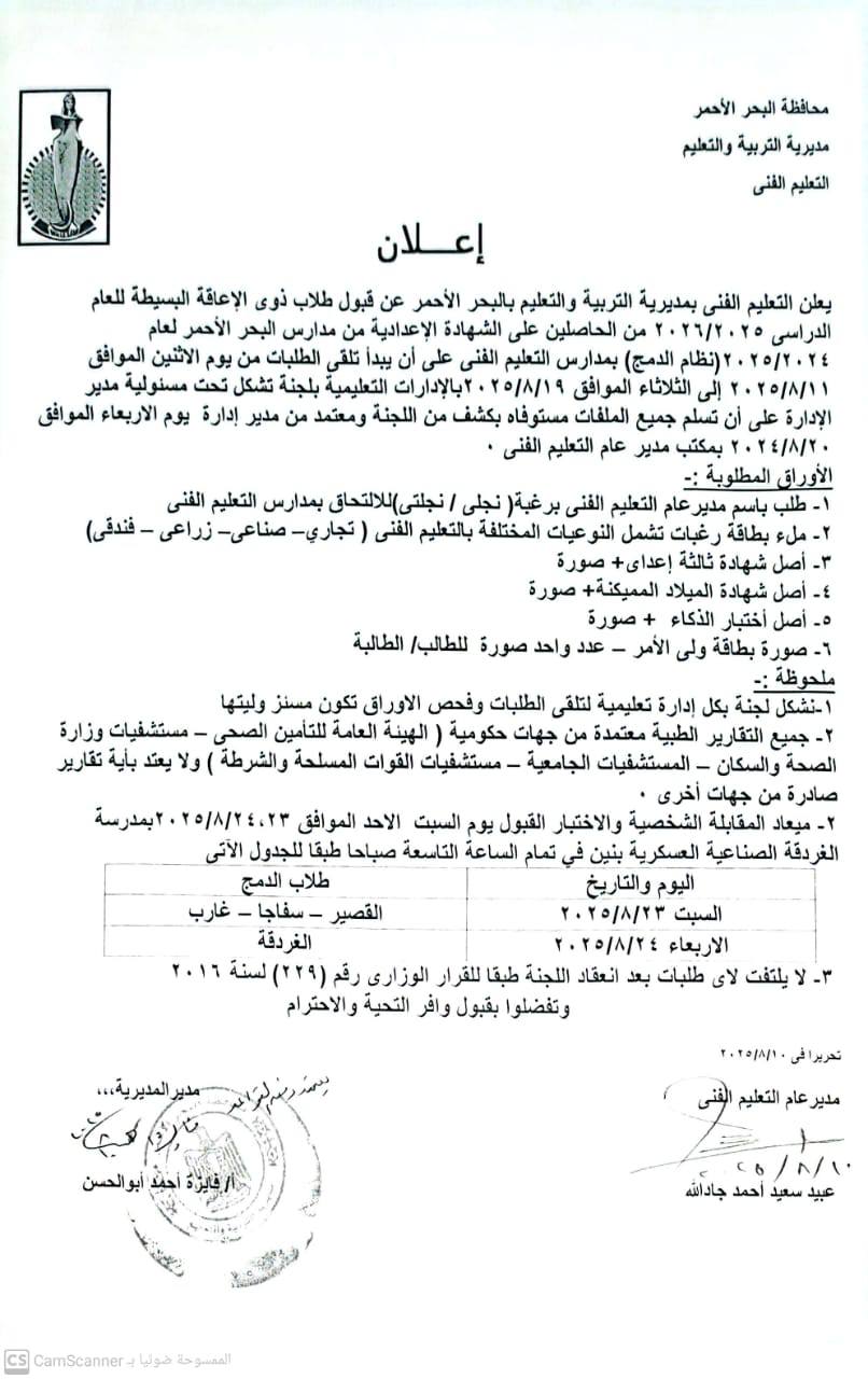 أعلن التعليم الفنى بمديرية التربية والتعليم بالبحر الأحمر، عن قبول طلاب ذوى الإعاقة البسيطة للعام الدراسي ۲۰۲٦/٢٠٢٥ من الحاصلين على الشهادة الإعدادية من مدارس البحر الأحمر العام ٢٠٢٥/٢٠٢٤ (نظام الدمج بمدارس التعليم الفنى.